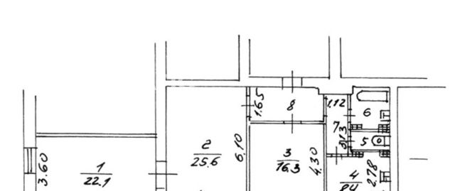 В квартире две изолированных спальных комнаты (22,1 + 16,3 кв. м.) и проходная гостиная (25,6 кв. м.). Есть балкон.
