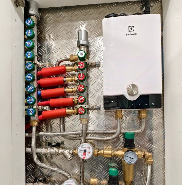 Душевая стойка и гигиеническая лейка с термосмесителями.