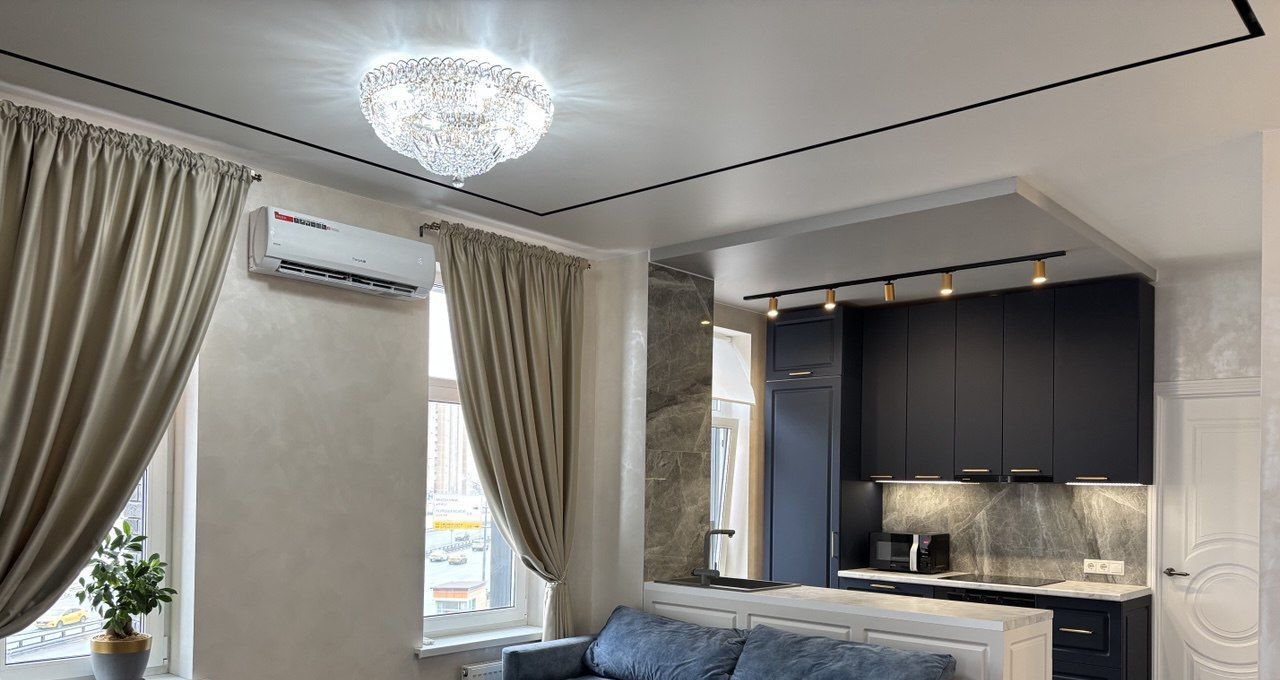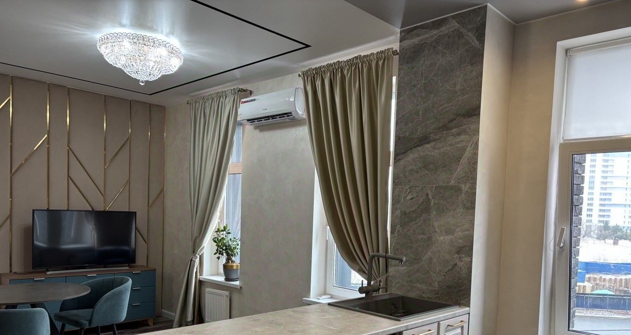- Состояние: дизайнерский ремонт, новая мебель и техника Кухнягостиная укомплектована всем необходимым: холодильник с морозильной камерой, посудомоечная машина, духовой шкаф, СВЧ, стиральная, сушильная машины. Также есть диван, телевизор, кресла, обеденный стол, кондиционер.