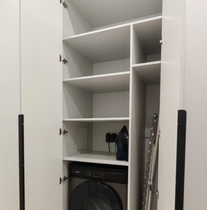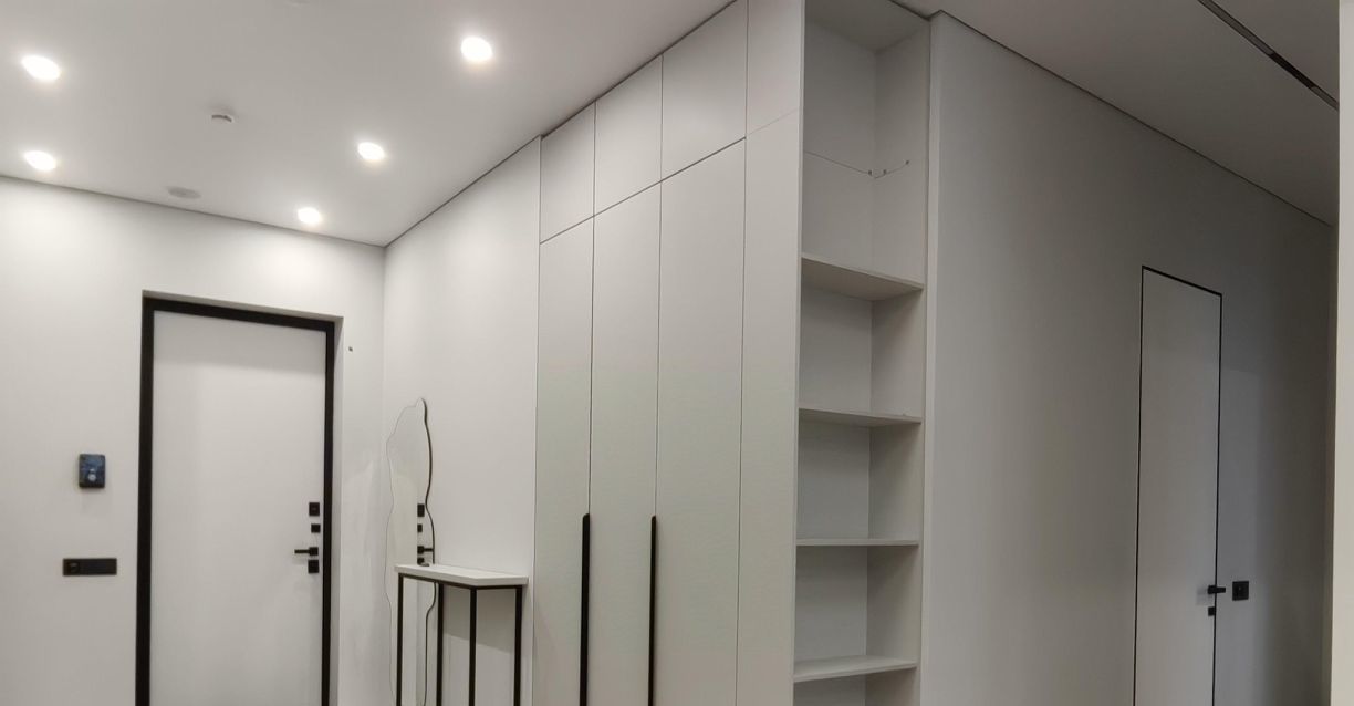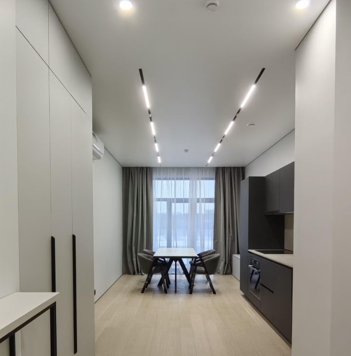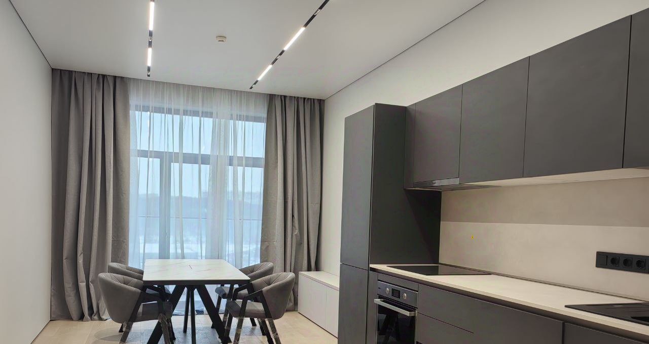 Часть мебели и техники согласуется и комплектуется под нанимателя, на сегодняшний день оформлена полностью кухня-гостиная: столовая группа (стол + 4 мягких стула), карнизы и шторы, заказана двухспальная кровать и диван, встроенная мебель в коридоре, а также зоне гардеробной. Дополнительно установлена: стиральная машинка.