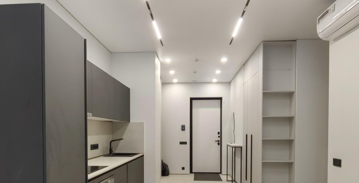 Кухонная зона оборудована гарнитуром со встроенной бытовой техникой: холодильником, морозильной камерой, посудомоечной машиной, вытяжкой, духовым шкафом и варочной панелью.