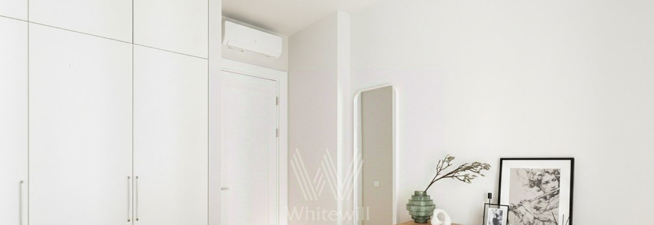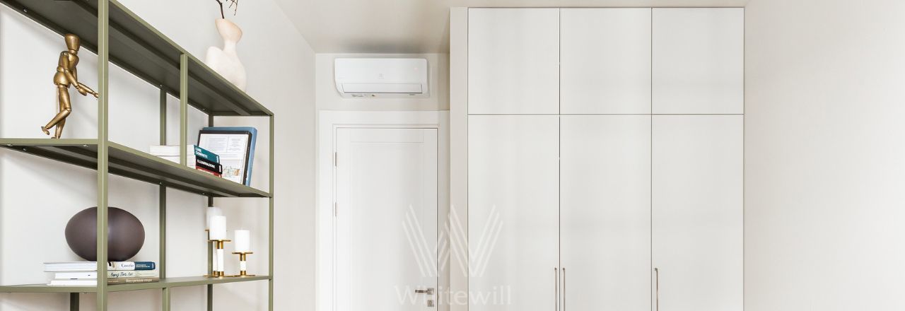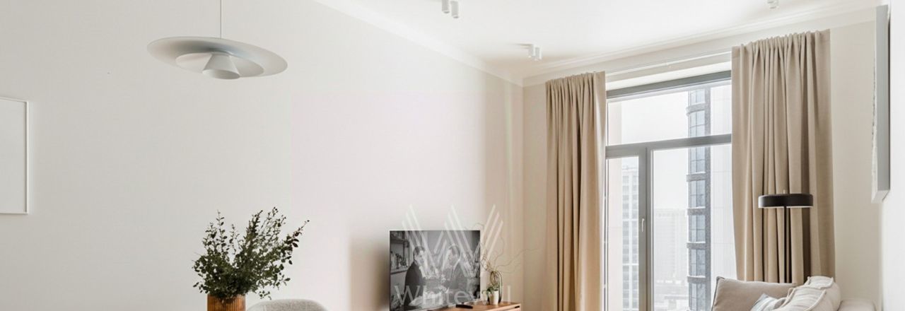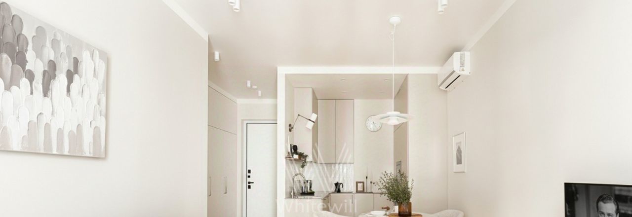 Спланирована кухня-гостиная с обеденной зоной, спальня, комната свободного назначения, которую можно использовать как кабинет или вторую спальню, санузел с душевой, гостевой санузел, прихожая. Квартира полностью меблирована и оборудована бытовой техникой, установлены кондиционеры, есть стирально-сушильная машина. Предусмотрено машино-место в подземном паркинге за отдельную плату.