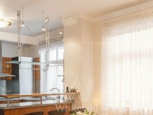 Планировка: просторная кухня-гостиная с обеденной зоной, спальня, жилая комната (можно использовать как спальню или кабинет), два совмещенных санузла с ванной и душевой кабиной, гардеробная комната, прихожая. Квартира меблирована, укомплектована необходимой бытовой техникой. В оформлении интерьера сочетаются стекло и натуральное дерево благородных коричневых оттенков.