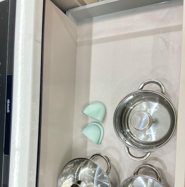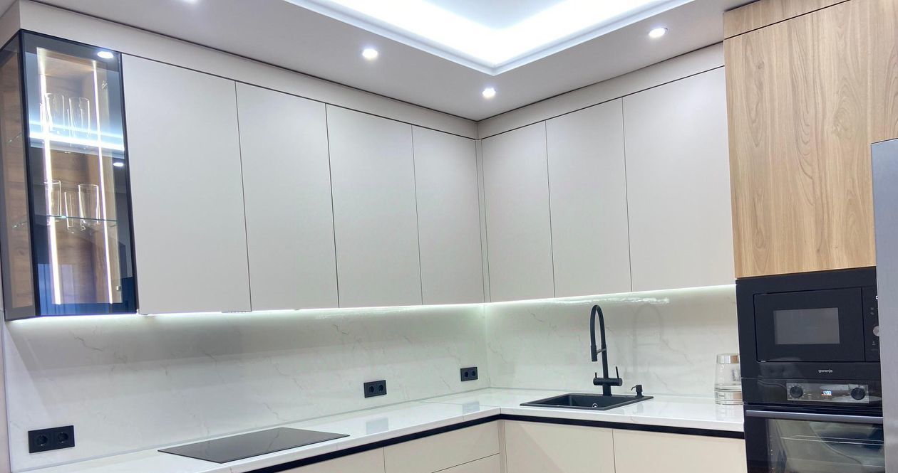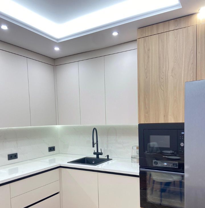 На кухне новый современный гарнитур, новая бытовая техника: встроенная посудомоечная машина, встроенная микроволновая печь, духовой шкаф, а также необходимая посуда: столовый сервиз на 6 персон,кастрюли, сковорода, чайник, столовые приборы. Кухня объединена с лоджией, что добавляет дополнительное пространство.