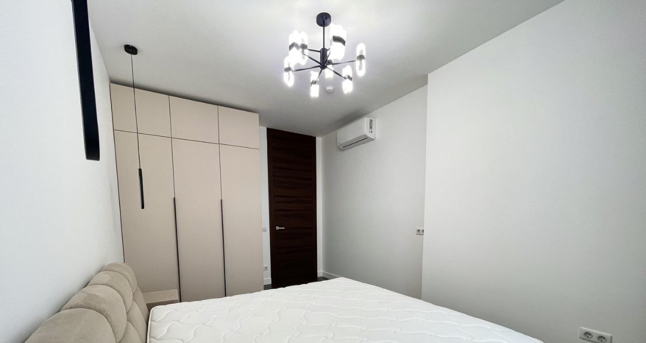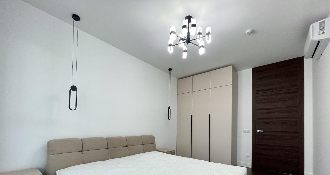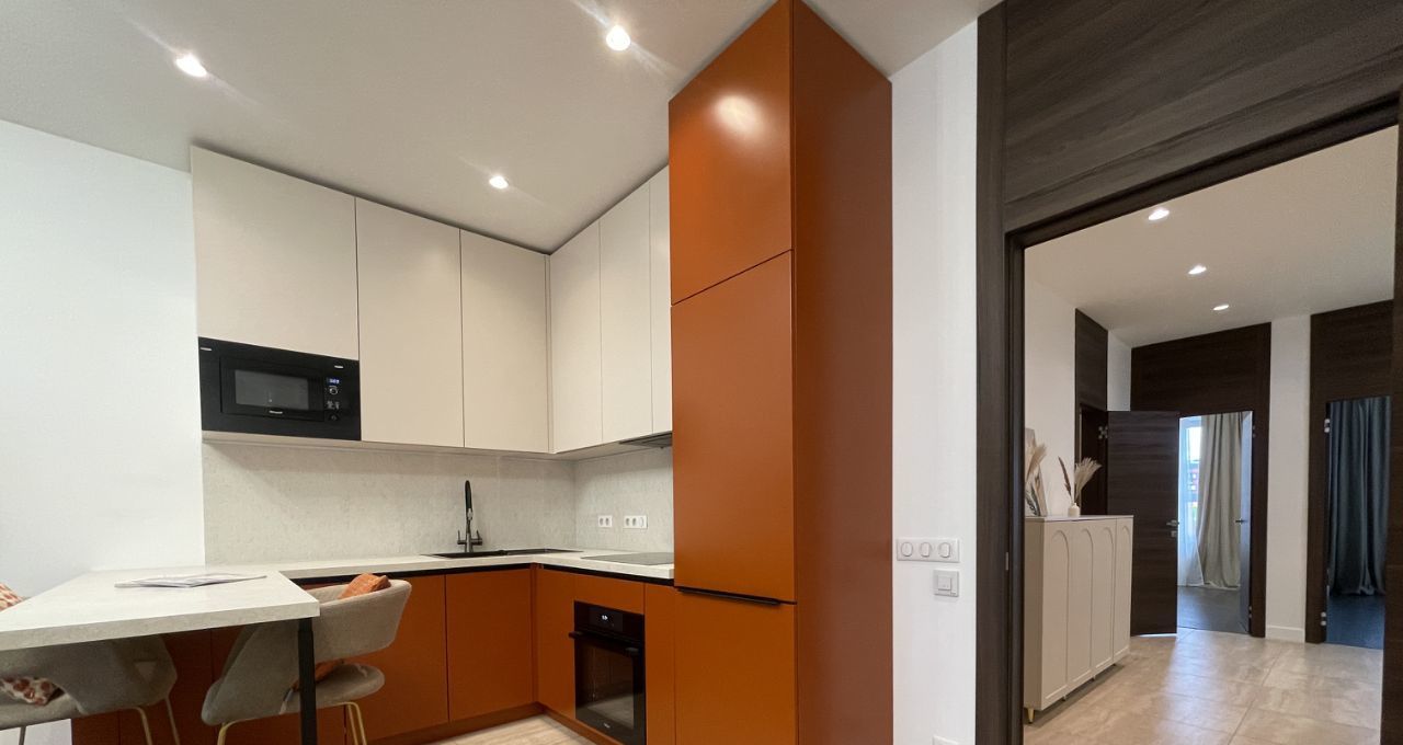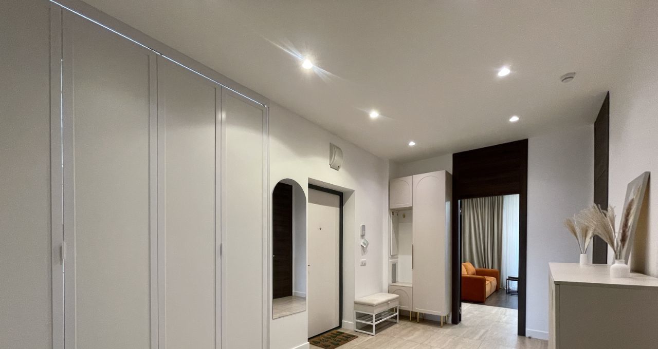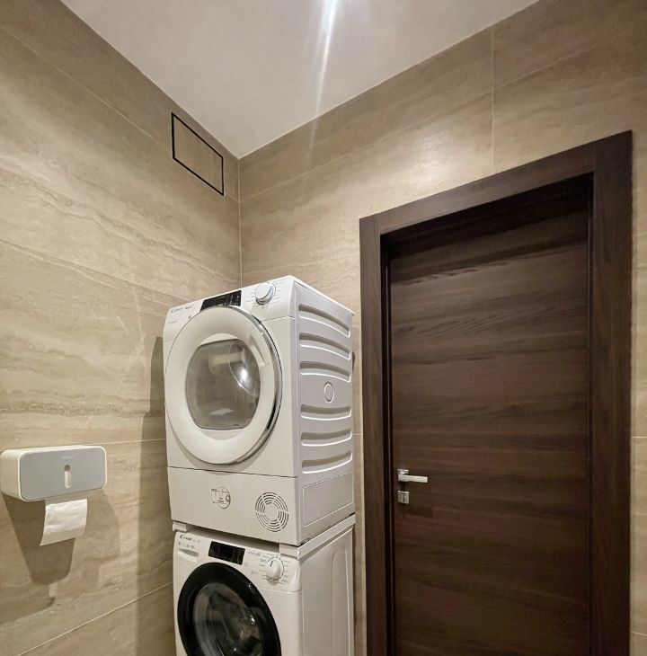 Квартира полностью меблирована и оснащена всей необходимой бытовой техникой: кондиционеры в каждой комнате, посудомоечная машина, духовой шкаф, холодильник, стиральная и сушильная машины, микроволновая печь, телевизор.
