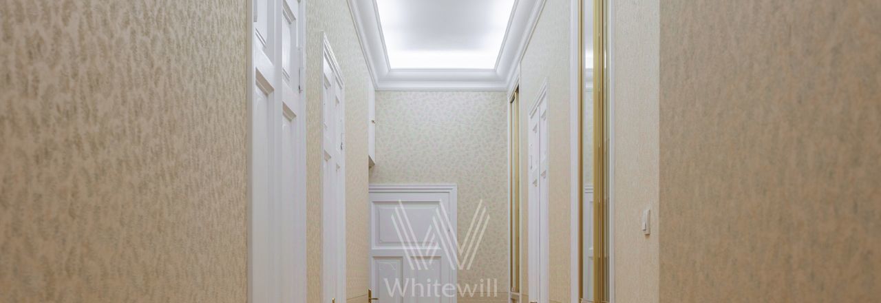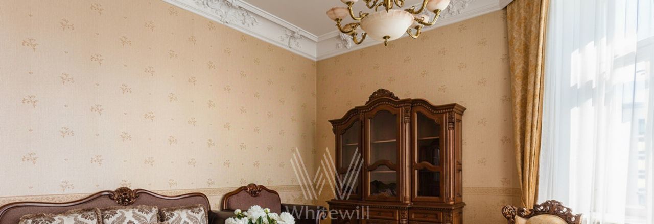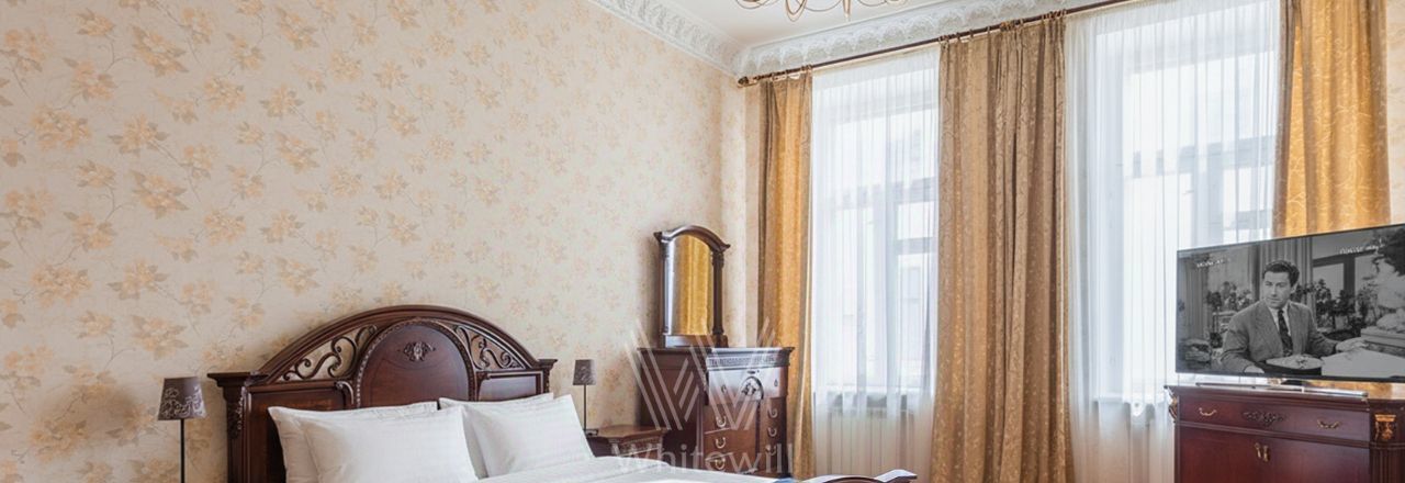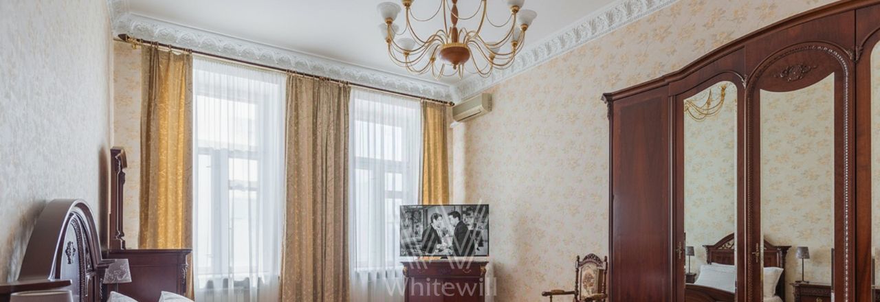 Просторная квартира площадью 190 м² в особняке "Петровка, 17" в центре Москвы, в 400 метрах от Большого театра и ЦУМ. Интерьер оформлен в классическом стиле, в отделке использовано натуральное дерево. Спланирована светлая гостиная, кухня-столовая, три спальни, кабинет, ванная комната, второй санузел с душем, кладовая, холл. Высота потолков 3,2 метра. Квартира укомплектована итальянской мебелью из ценных пород дерева, премиальной техникой. Установлены новые телевизоры, посудомоечная машина. Предусмотрена система кондиционирования, бойлер. Из окон открывается вид на центр города. В стоимость входит машино-место во дворе.