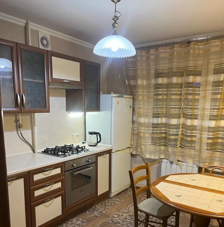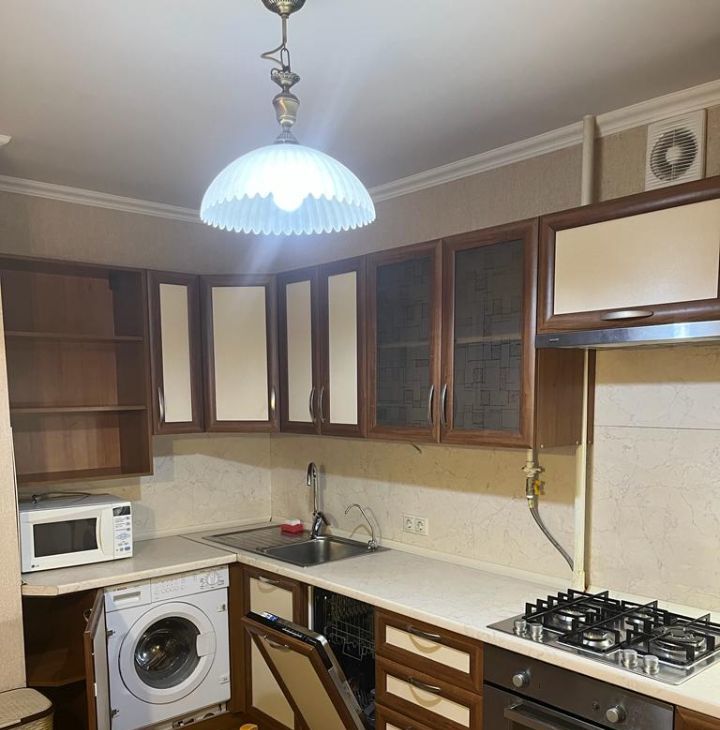 Кухня - встроенный кухонный гарнитур под единой столешницей, посудомоечная машина, стиральная машина, 2-х камерный холодильник. Обеденный стол и стулья.