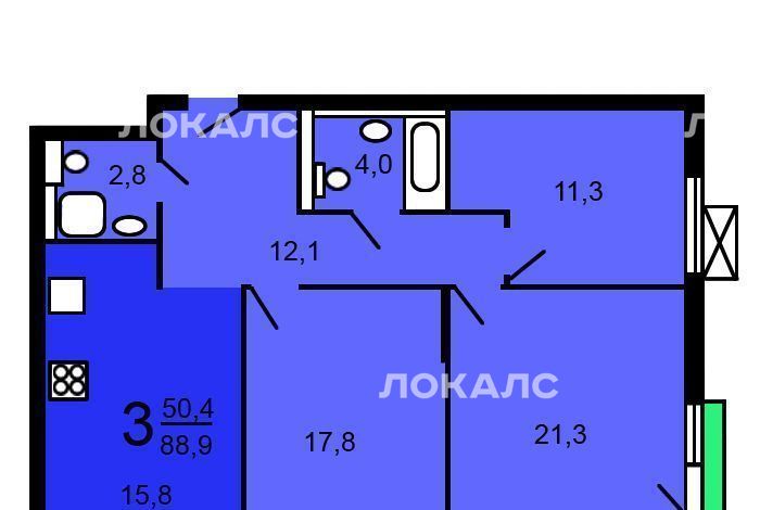 Комнаты: 21,3, 17,8 и 11,3 кв.м