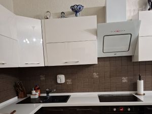 Удобная кухня со всей необходимой техникой (дух. шкаф, микроволновая печь, индукционная варочная панель, посудомоечная машина, измельчитель отходов, зона для сортировки мусора, 2х-дверный холодильник).