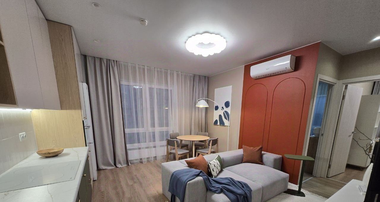 Вашему вниманию предлагается евро-трешка с продуманной планировкой: кухня-гостиная, отдельная спальня и комната, раздельный санузел. Интерьер в спокойных тонах с тёплыми акцентами, аккуратная отделка и приятный свет. Квартира полностью укомплектована всем необходимым - идеальный вариант для семьи. Интерьер выдержан в спокойной современной палитре с тёплыми терракотовыми акцентами. В квартире предусмотрено много шкафов и встроенных решений, мебель и декор подобраны в едином стиле.