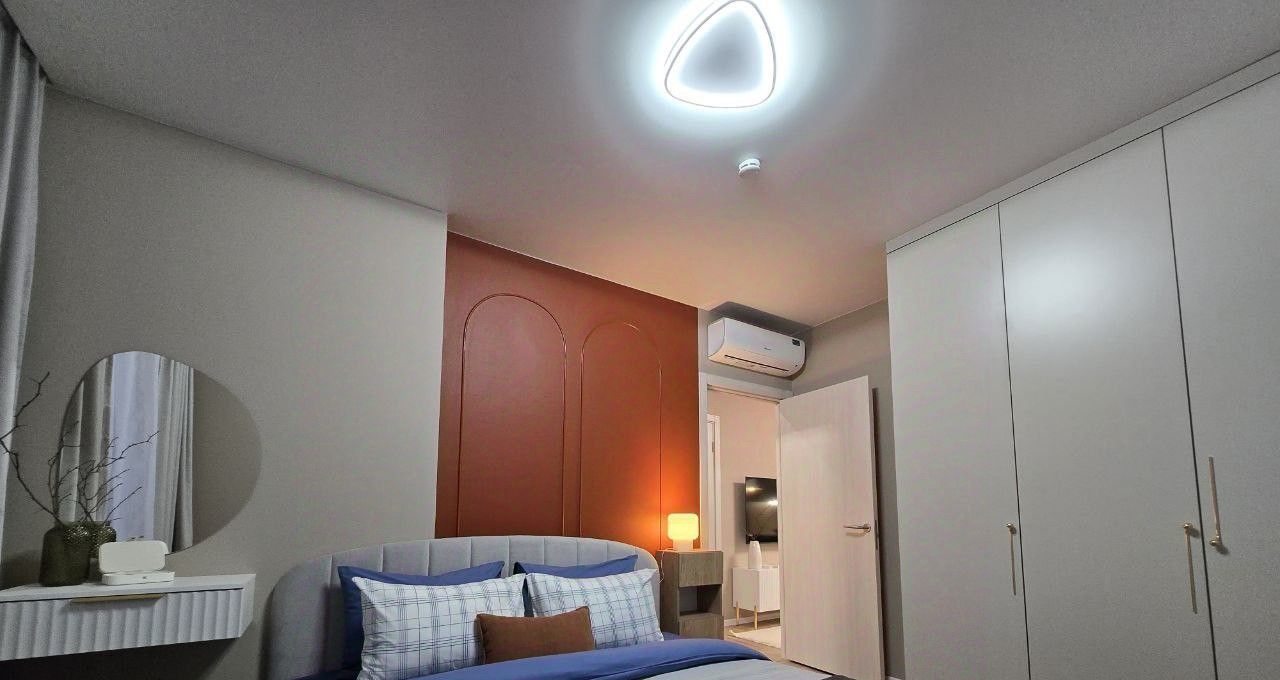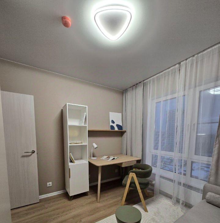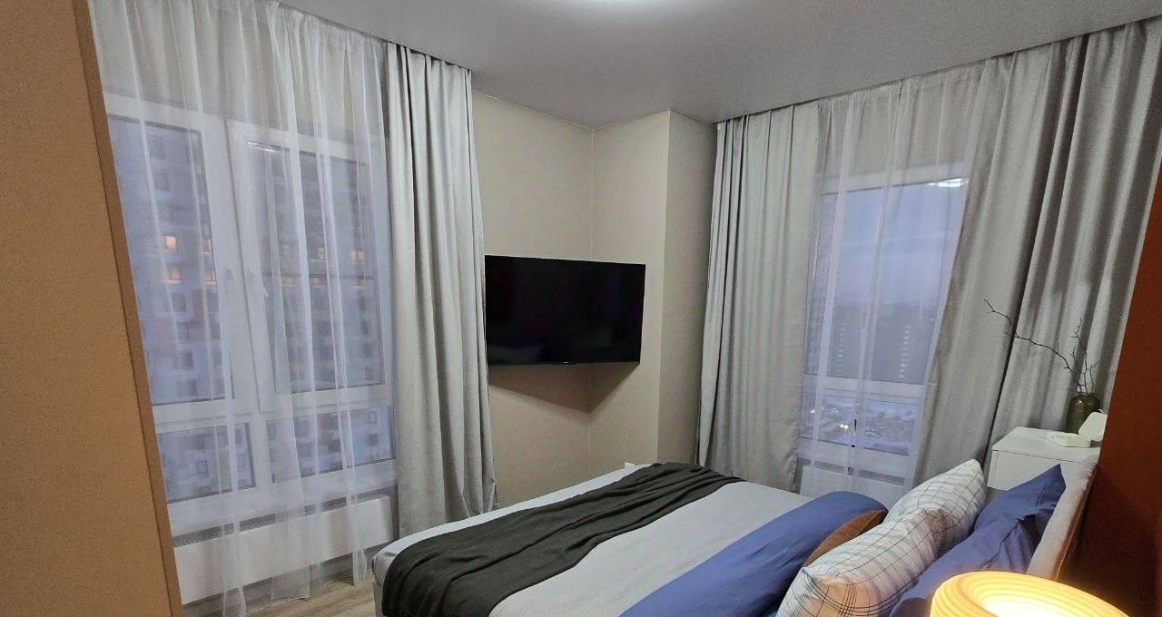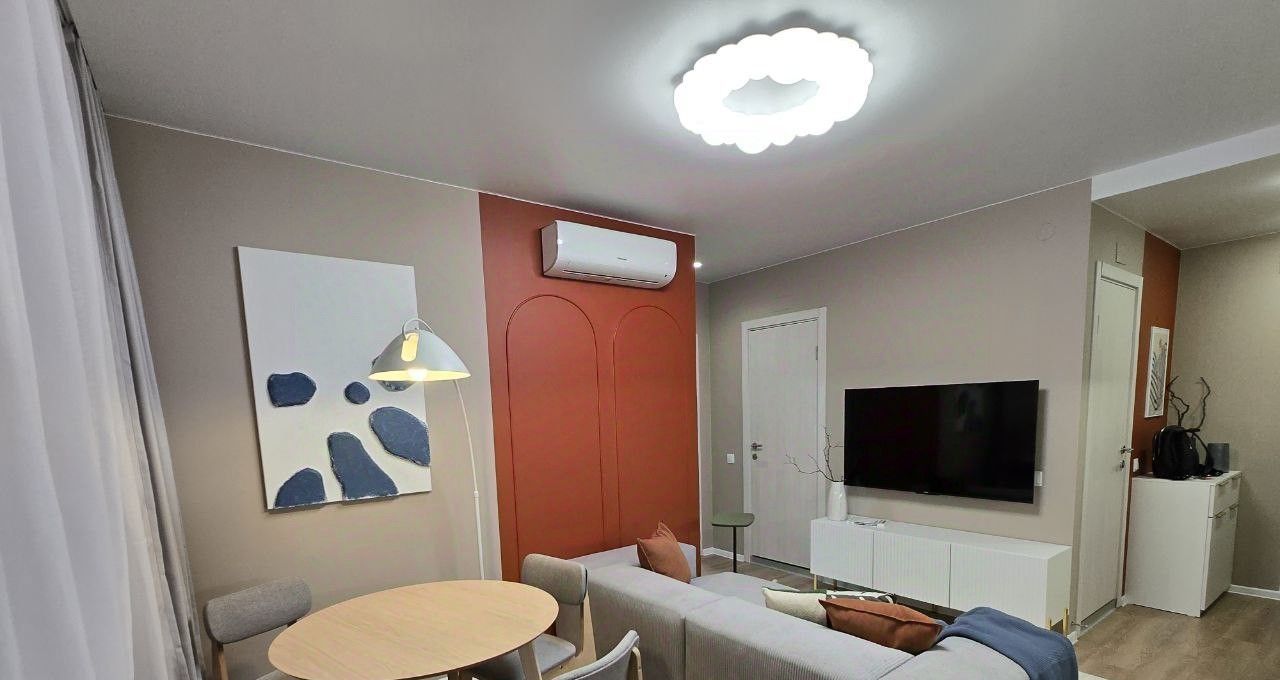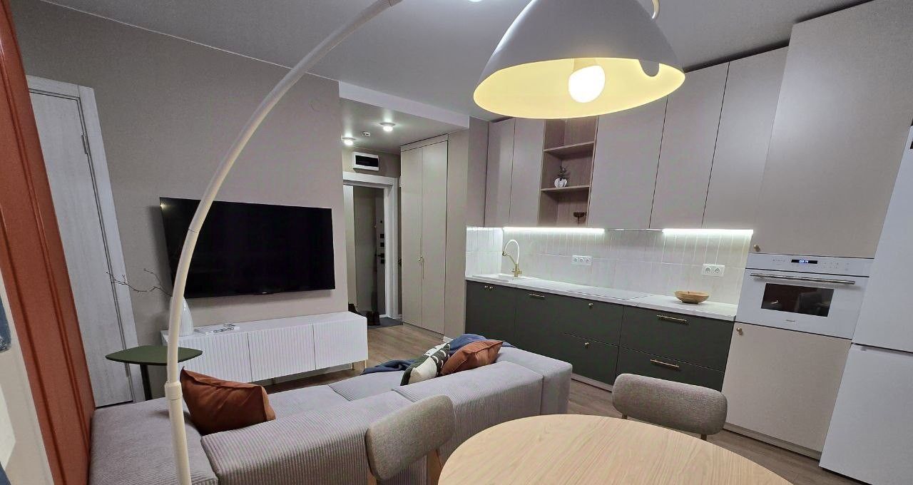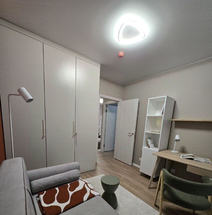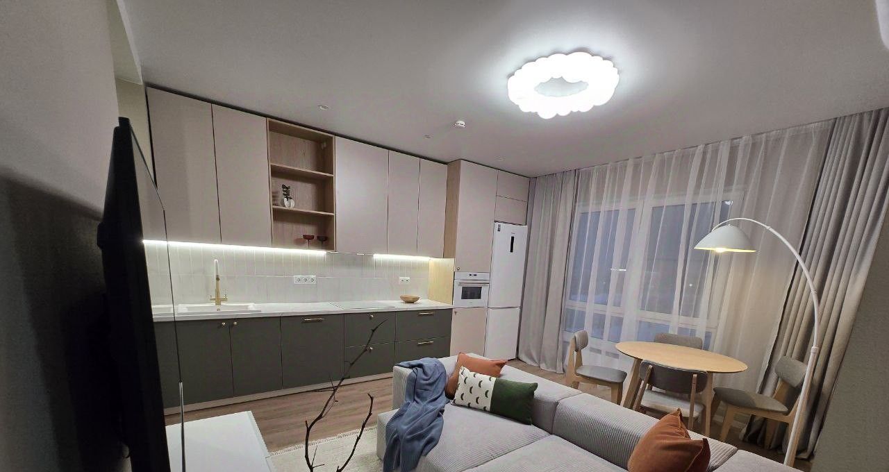 Кухня гостиная — основное пространство квартиры: здесь комфортно готовить, ужинать и отдыхать. Встроенная кухня с подсветкой, обеденная зона на 4 персоны, зона отдыха с диваном и большим ТВ. Всё предусмотрено для жизни и приёма гостей. Отдельная спальня с двуспальной кроватью — пространство настроено на отдых: мягкий свет, спокойные оттенки, минимум визуального шума. Отдельную комнату можно использовать как кабинет, гостевую или детскую: полноценный стол, настольная лампа, удобное кресло.