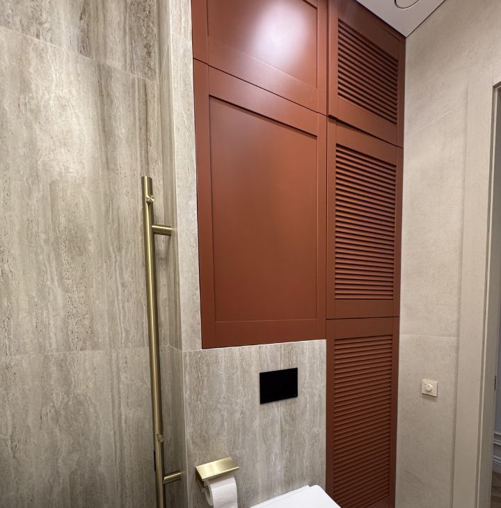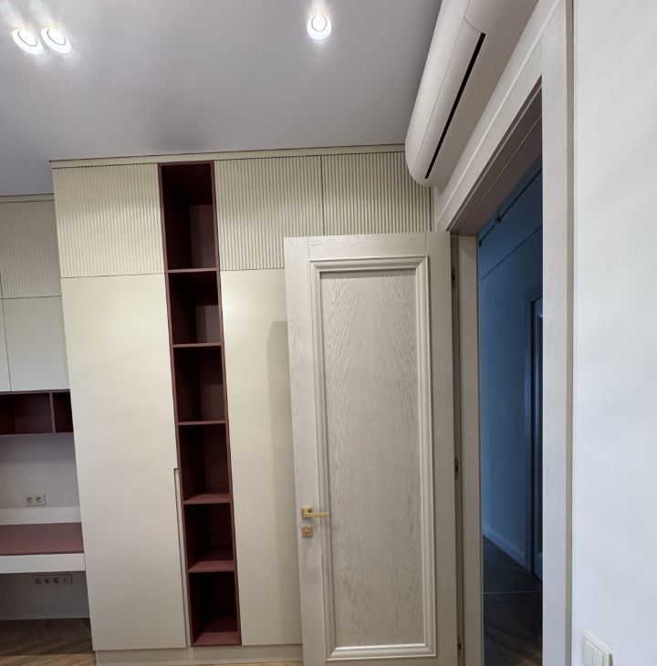 За акцентными дверями скрывается гардеробная с удобной системой хранения: полки, ящики, пьедесталы для сумок и обуви.