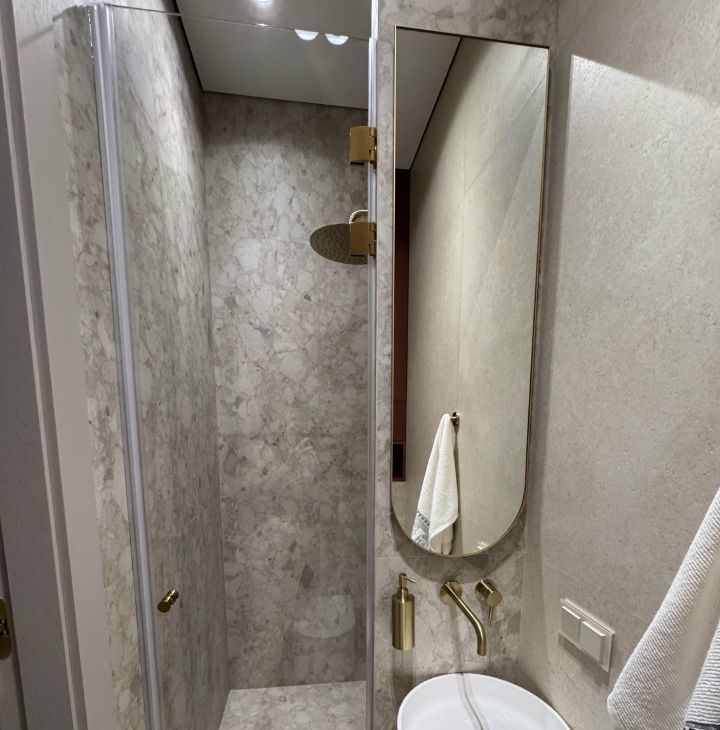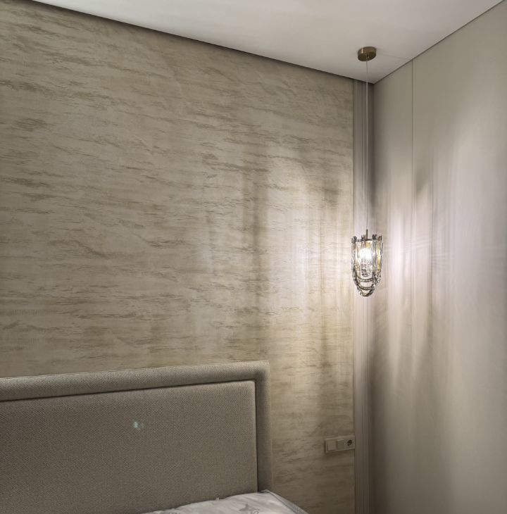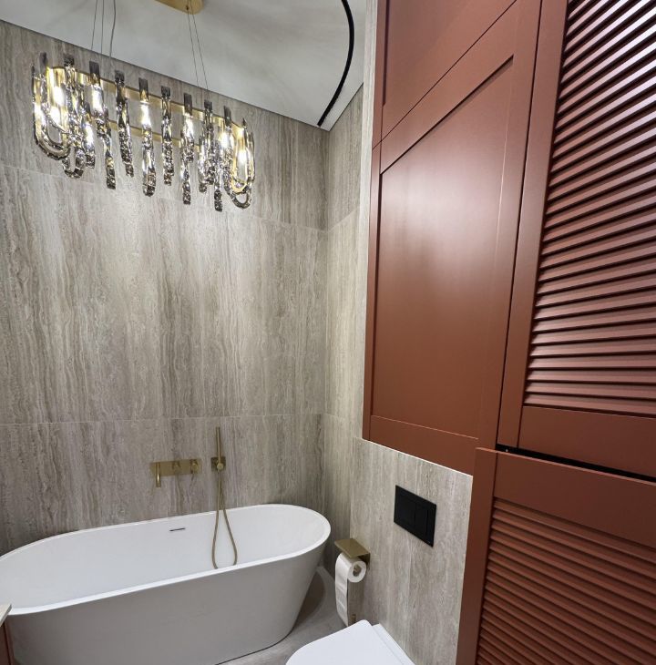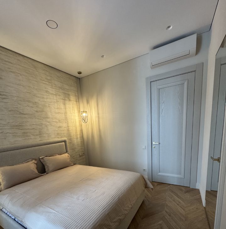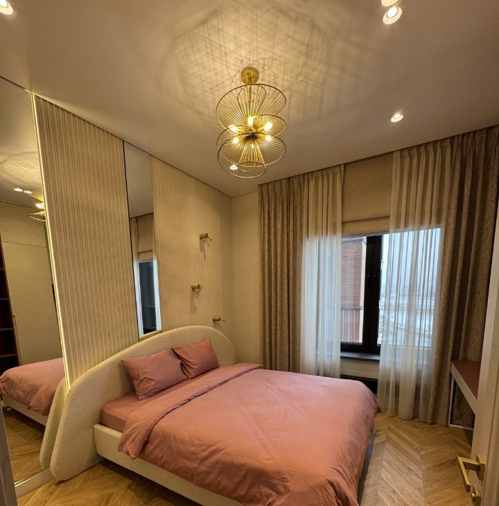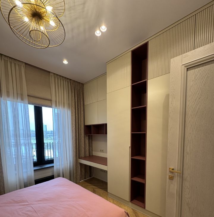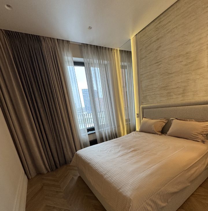 В спальне - большая кровать с ортопедическим матрасом, вместительная гардеробная , тёплый текстиль. Панорамные окна легко закрываются шторами-блэкаут на электро карнизе с пультом управления , и комната превращается в место глубокого отдыха.