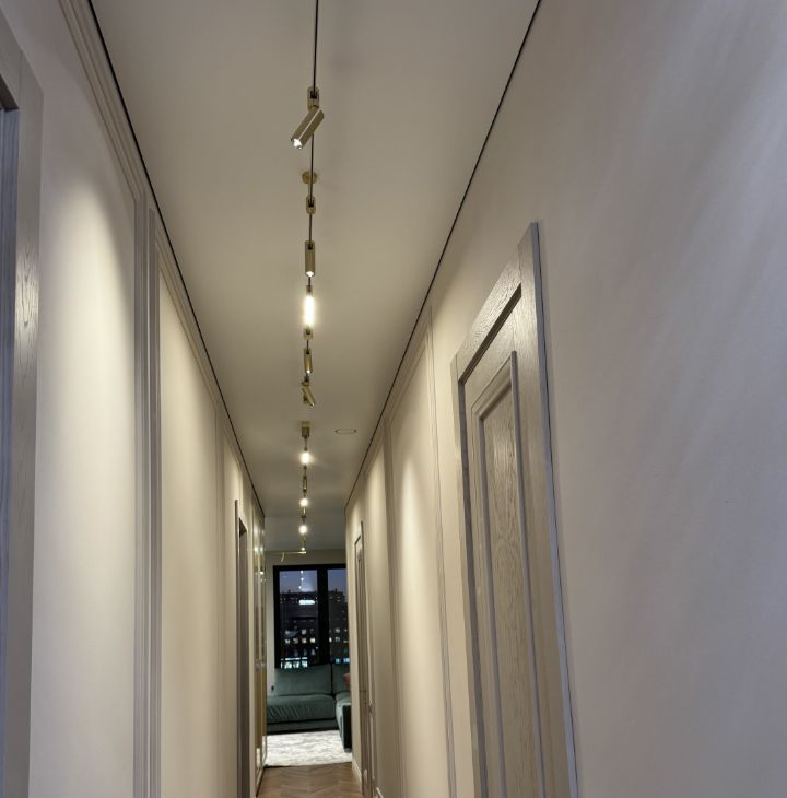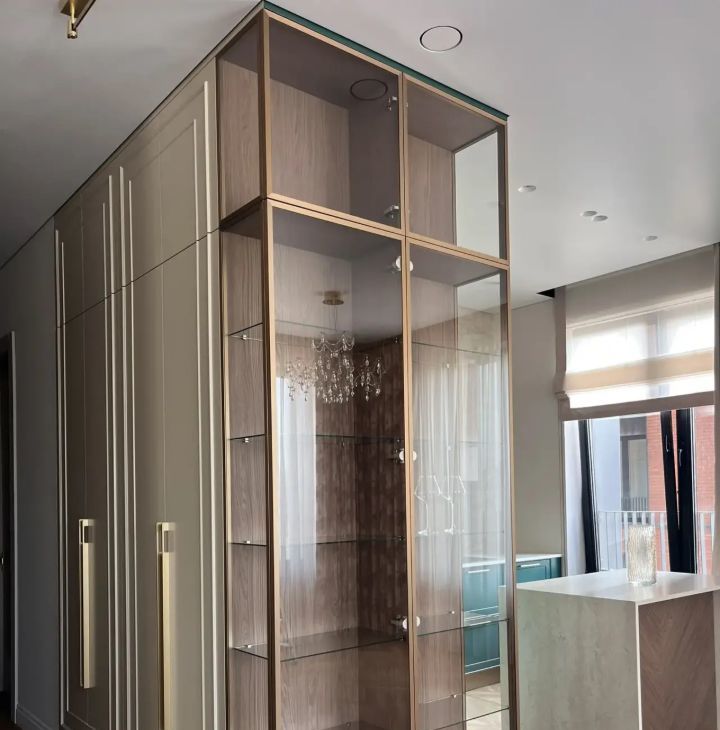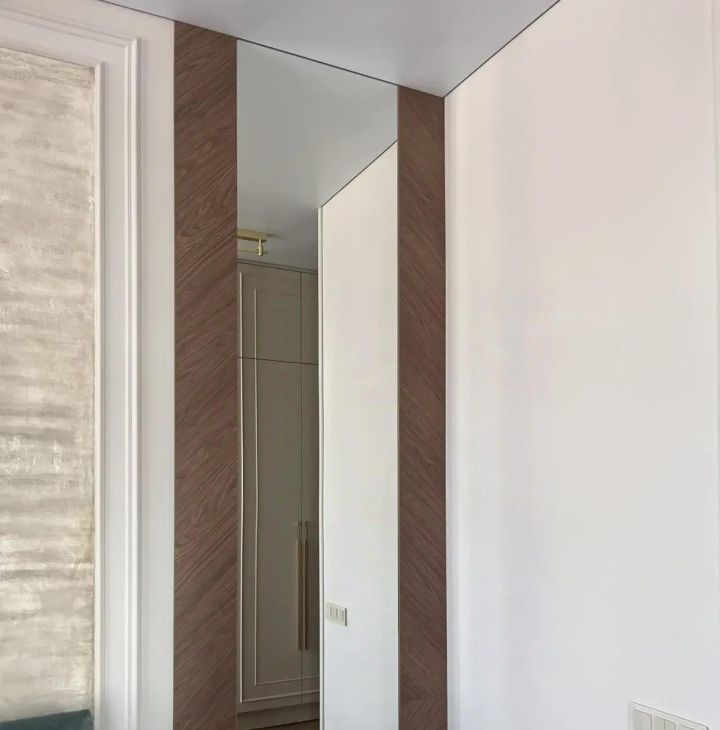 С первых шагов вас встречает просторная прихожая: консоль, зеркало, мягкий свет - и сразу ощущение масштаба, потому что открывающийся на город и реку вид видно с порога.