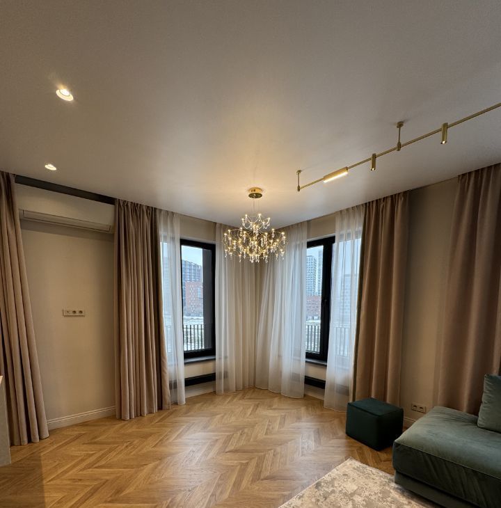 Оснащение: дизайнерское сценарное освещение (несколько режимов, управление одной кнопкой), плотные шторы-блэкаут в спальне. Мебель и техника: полностью укомплектована (встроенный холодильник, духовка/микроволновка, посудомоечная машина, мелкая техника - чайник, блендер и др.; диван, кровати с ортопедическими матрасами, шкафы, телевизор).