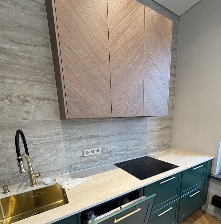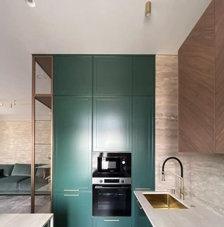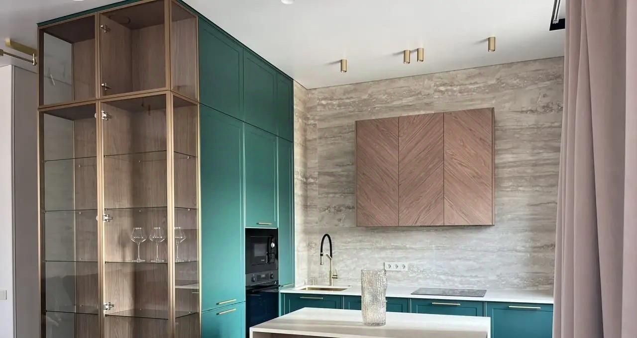Встроенная техника, стеклянный шкаф с посудой, круглый стол на шесть персон и мягкий диван с раскладным механизмом - всё уже готово к повседневности и праздникам. Атмосферу меняет сценарное освещение: одним нажатием пространство становится то ярким и рабочим, то мягким и вечерним.