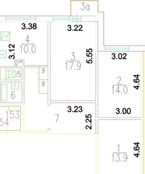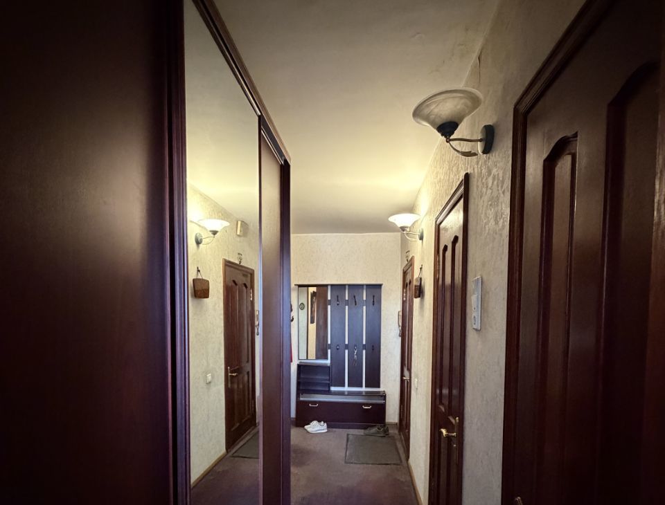 Жилая площадь составляет 46 кв. м (комнаты большие и светлые - 18, 14 и 14 кв.м), кухня — 10 кв. м. Удобный коридор с очень вместительным шкафом. Балкон (незастекленный) и лоджия (застеклена) в комнатах.