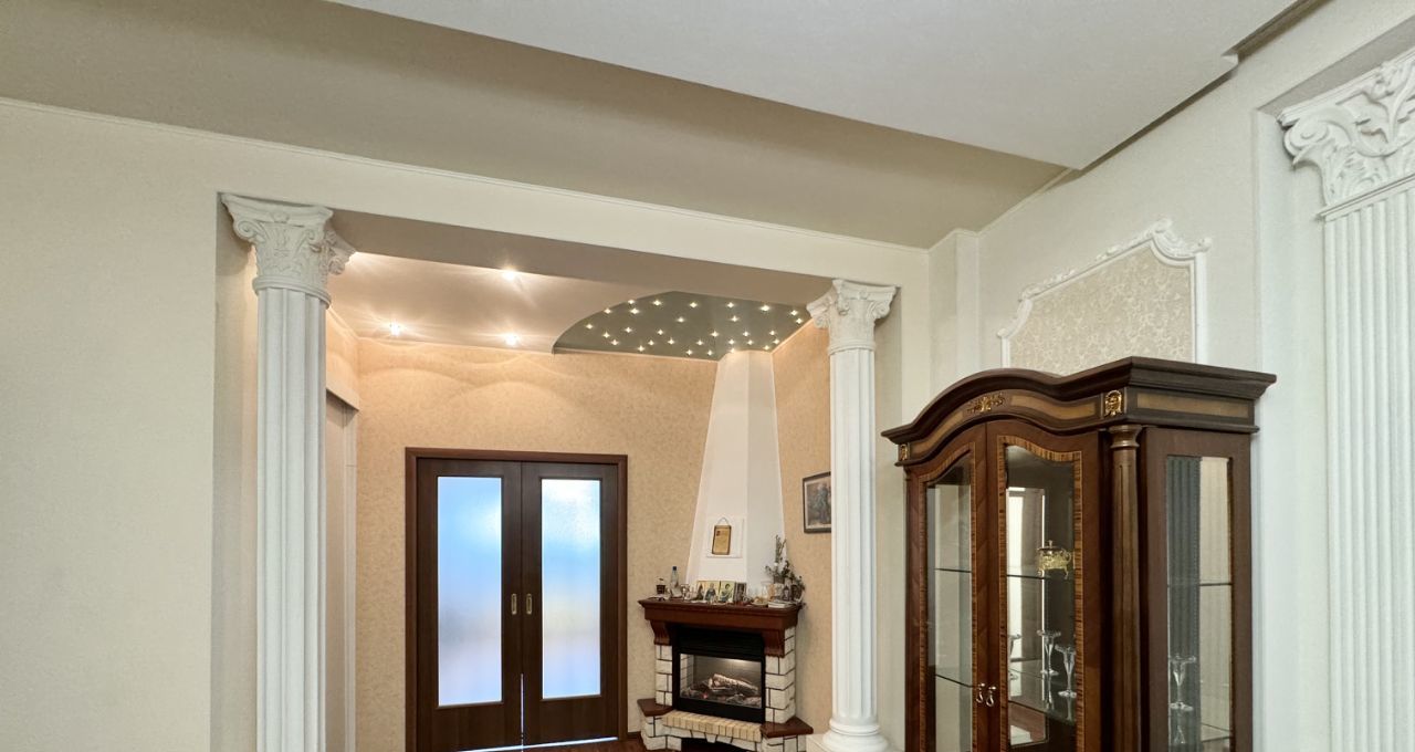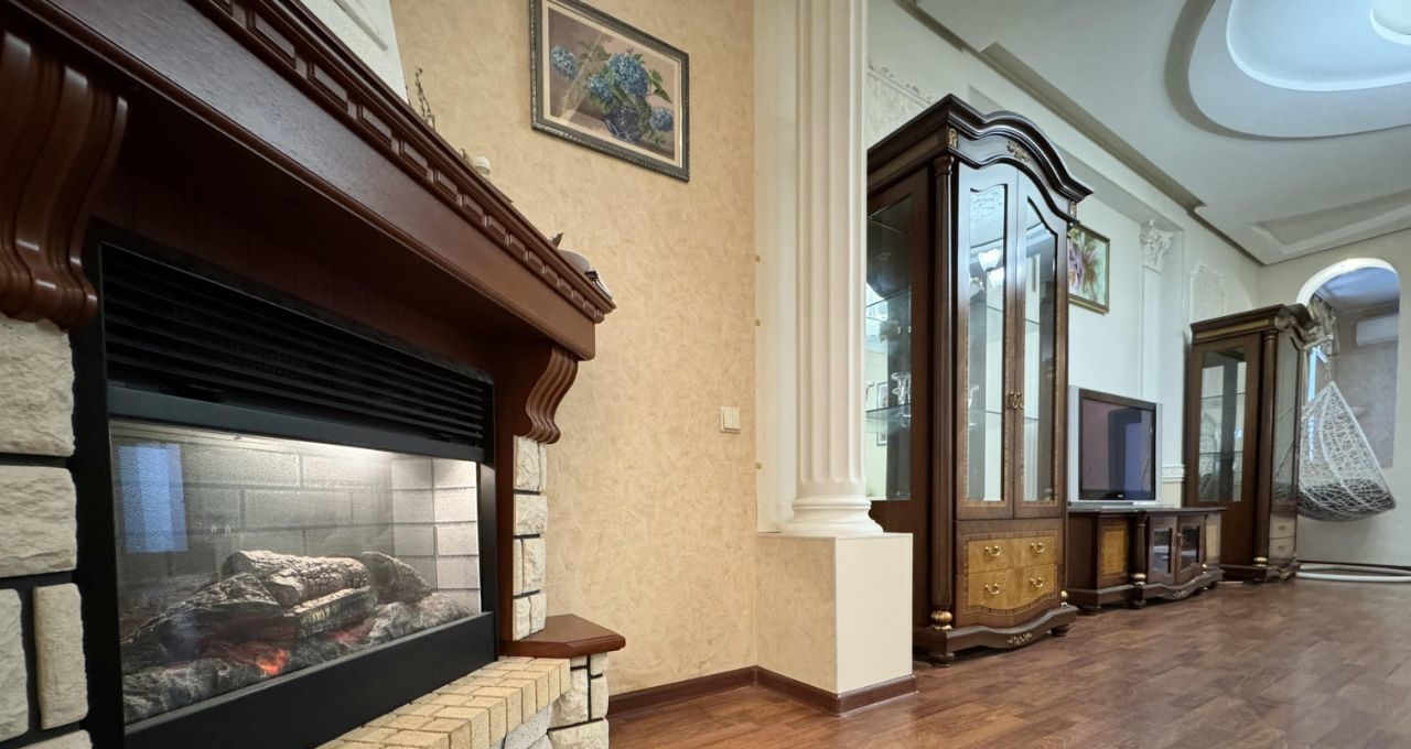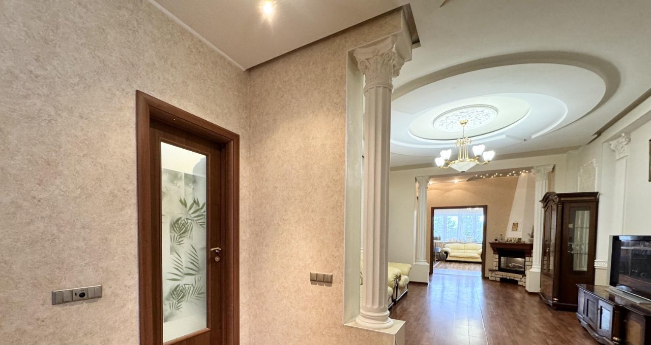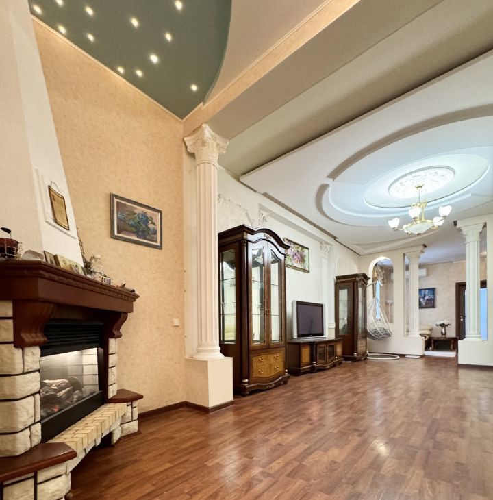 прихожая, гардеробная, санузел, холл, спальня с большим шкафом, зал с камином, кухня-столовая, мастер-спальня, кабинет с большими стеллажами и вместительным гардеробом.