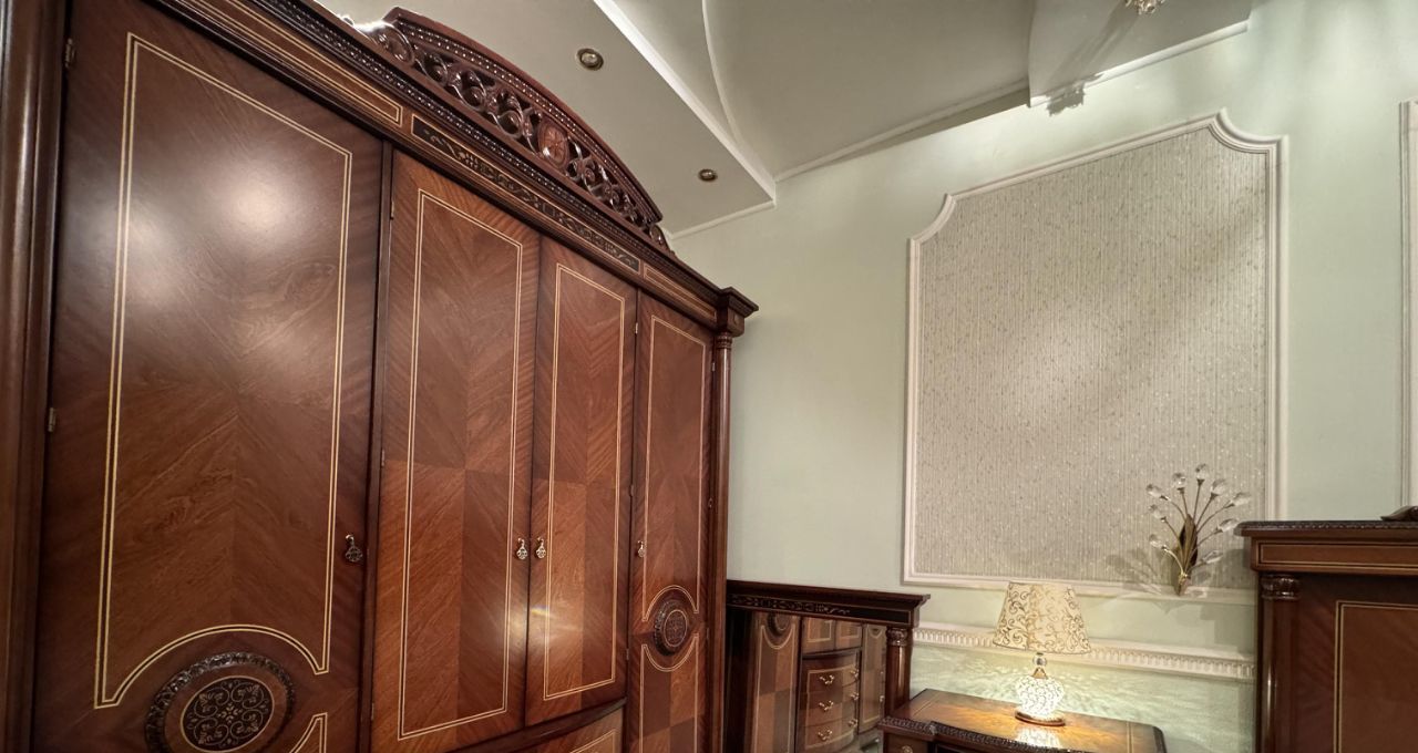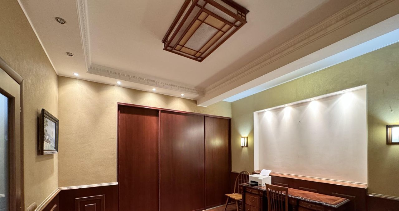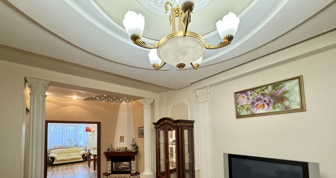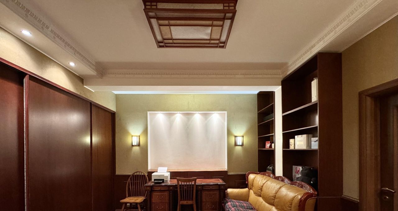 прихожая, гардеробная, санузел, холл, спальня с большим шкафом, зал с камином, кухня-столовая, мастер-спальня, кабинет с большими стеллажами и вместительным гардеробом.