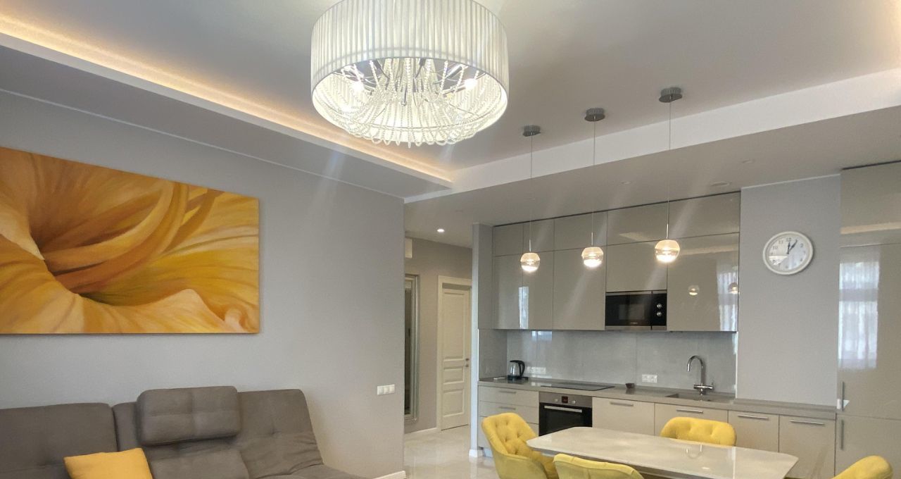 полностью оснащена всей мебелью и бытовой техникой : СВЧ, ПММ, Холодильник , духовой шкаф, варочная панель, кондиционеры , ТВ.
