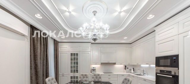Элегантная квартира с уникальной атмосферой уюта и статуса. Просторная кухня-гостиная, спальня, детская, кабинет, постирочная комната, лоджия, два санузла — с ванной и душевой.