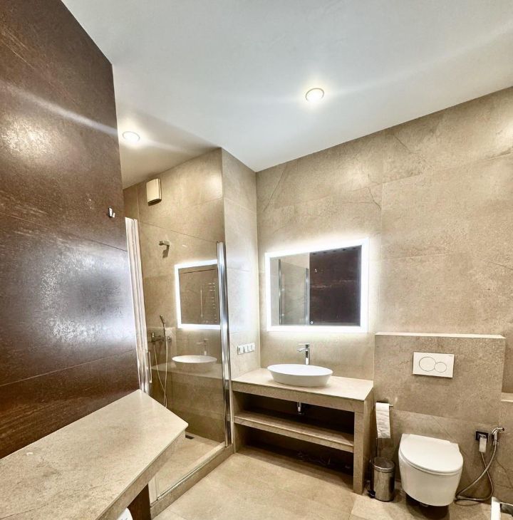 Просторная квартира в элитном ЖК. Две большие лоджии с теплым полом. От метро 10-12 минут пешком. Панорамный вид из окон. Три изолированные комнаты. Вся необходимая мебель, двуспальные кровати, диван, вместительные шкафы и три гардеробные. А также техника стиральная машина, холодильник, посудомоечная машина, везде стоят кондиционеры, теплые полы. Два совмещенных санузла с душевыми и один с ванной. В подземном паркинге сдаются машиноместа. Сдается на длительный срок.