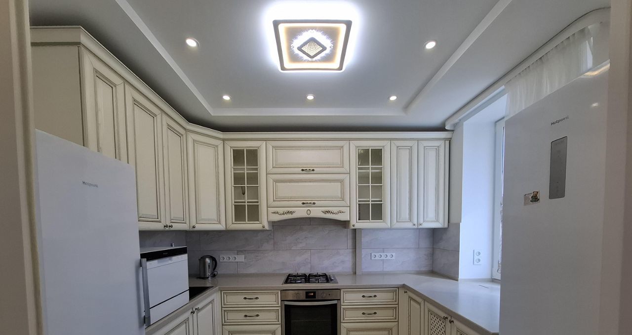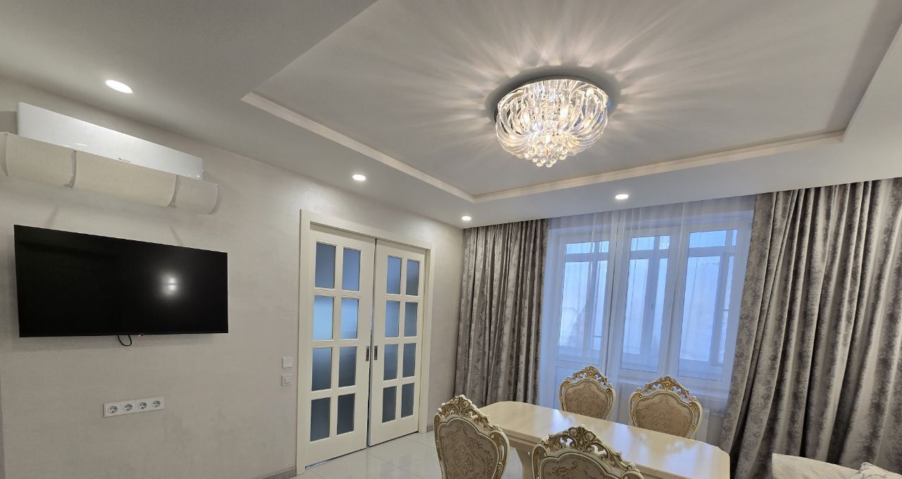 Гостиная - столовая (обеденный стол, 6 стульев, диван, телевизор), комната с выходом на балкон (остеклен, окна во двор) и проходом (раздвижная дверь) на Кухню (встроенная бытовая техника, фасады массив дерева)