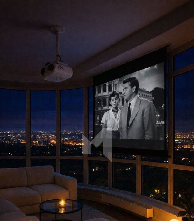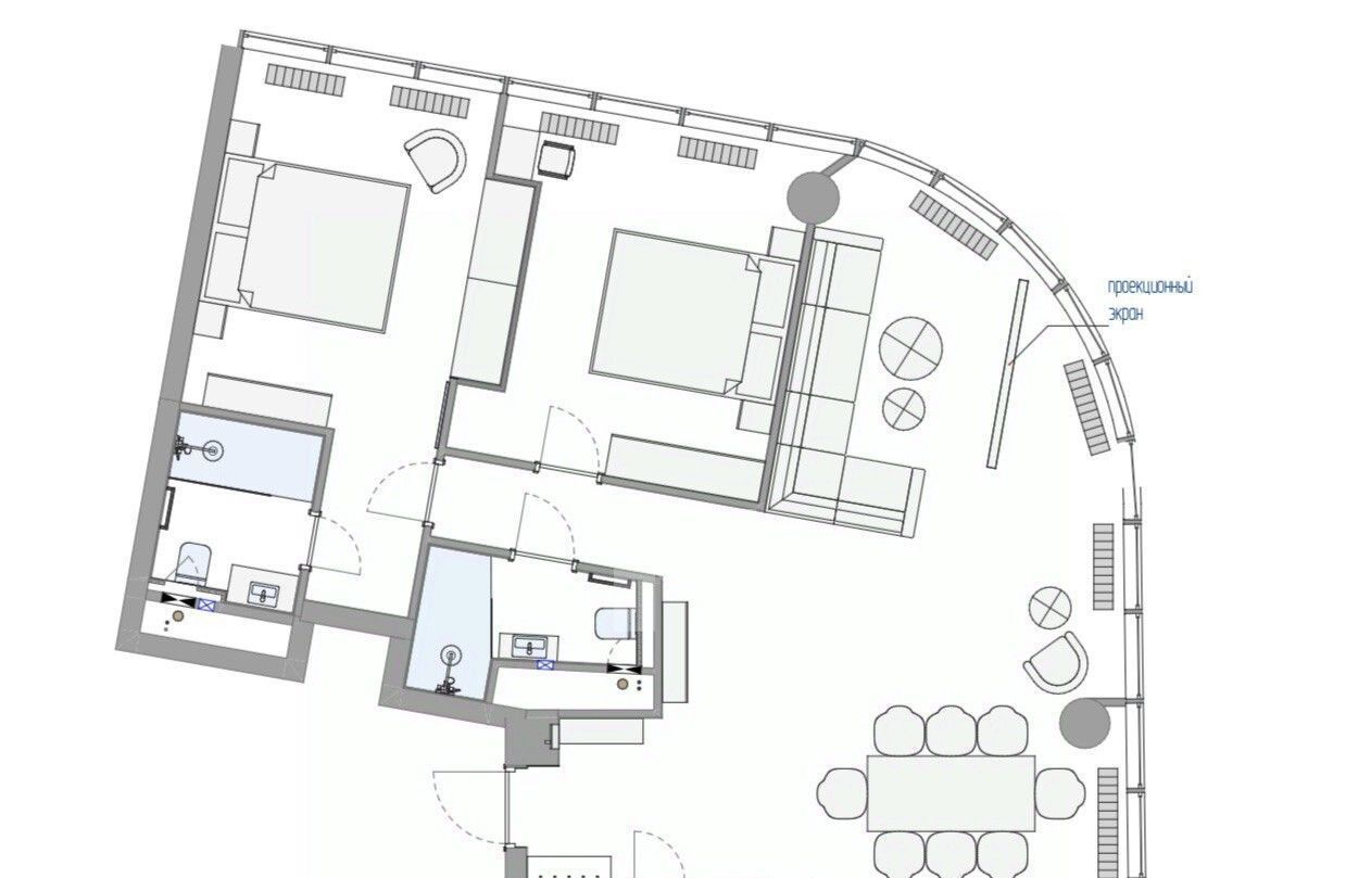 Планировкой предусмотрено: просторная гостиная с четырьмя функциональными зонами: огромный угловой диван, лаунж-зона с креслом и торшером, большой обеденный стол для семейных ужинов, кухня с барной стойкой для утреннего кофе с видом на город. Отдельное удовольствие — большой экран, опускающийся с пульта у панорамного окна.
