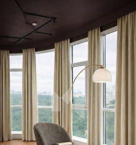 Меблировка подбирается с акцентом на комфорт, эстетику и тактильность: мягкая и стильная мебель, акцентные винтажные предметы, добавляющие характер и глубину, на стенах — гравюры и современное искусство, создают ощущение галерейного, но тёплого пространства. Панорамные окна по радиусу, струящиеся шторы с автоматической системой открывания, благородный дубовый пол медового цвета, открытый потолок глубокого шоколадного тона с индустриальным характером и мягкий, теплый свет со множеством световых сценариев - все создает уют и атмосферу.