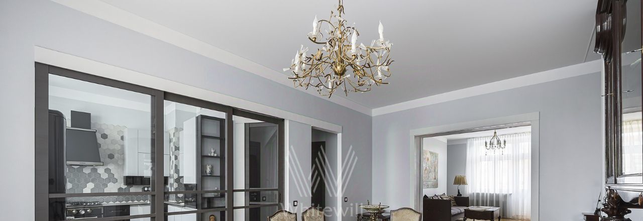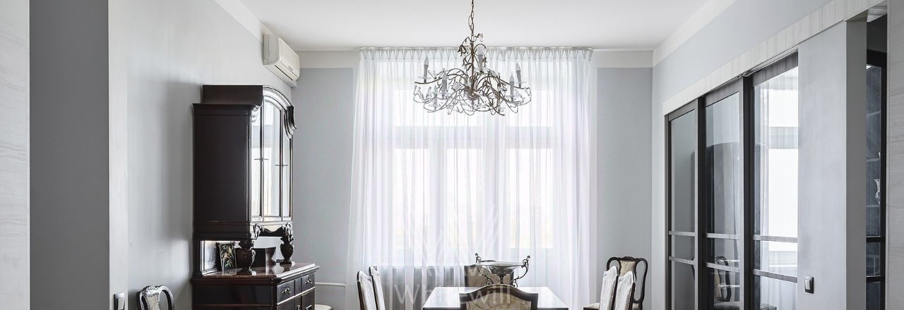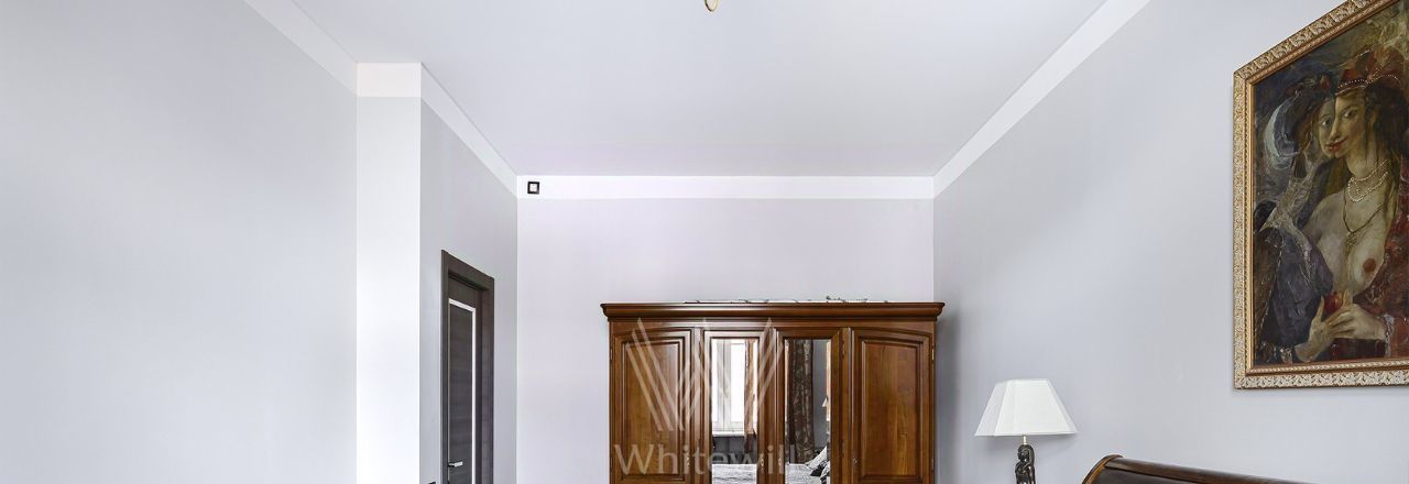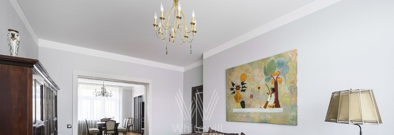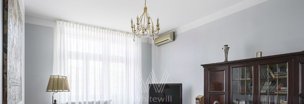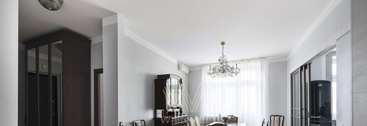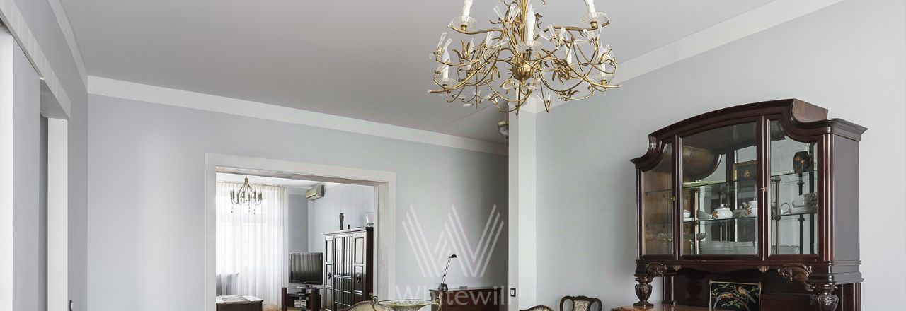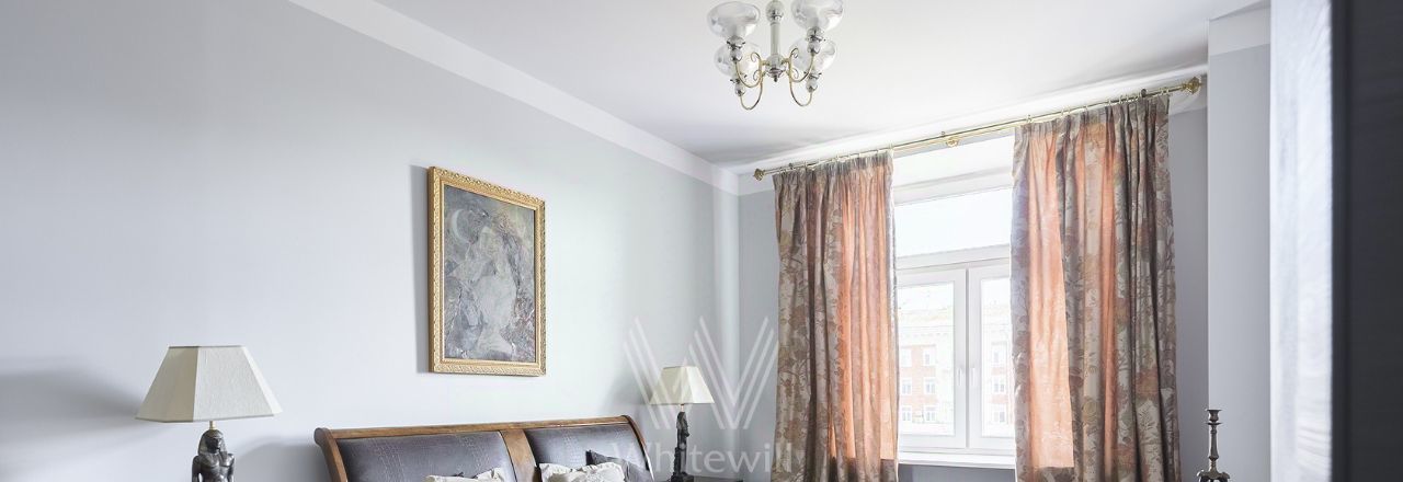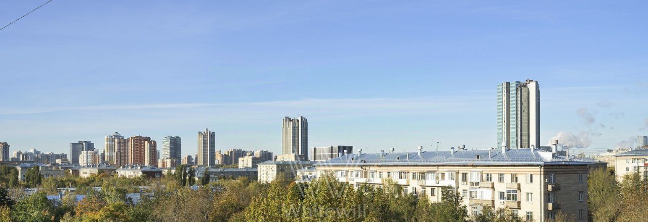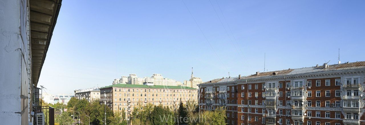 Просторная квартира с 2-мя спальнями площадью 105 м² в сталинском доме вблизи МГУ. В квартире выполнен авторский ремонт в классическом стиле. На полу уложен светлый паркет, интерьер оформлен в бежевых тонах. Из просторной гостиной можно выйти в столовую на 6 персон. Кухня оснащена бытовой техникой. В спальнях оборудованы двуспальные кровати и шкафы для хранения вещей. Квартира меблирована антикварной мебелью и укомплектована кондиционерами. Окна гостиной выходят на восточную сторону, а из столовой можно наблюдать живописные закаты.