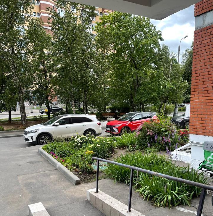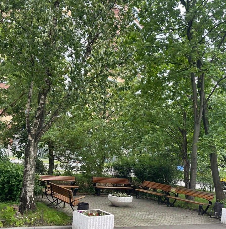 Территория двора озелененная, в хорошем состоянии, с цветниками, деревьями, детской площадкой, зоной со скамейками для отдыха, б/п автомобильной парковкой.