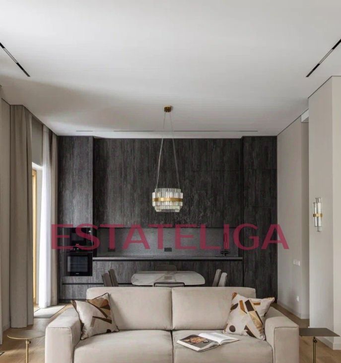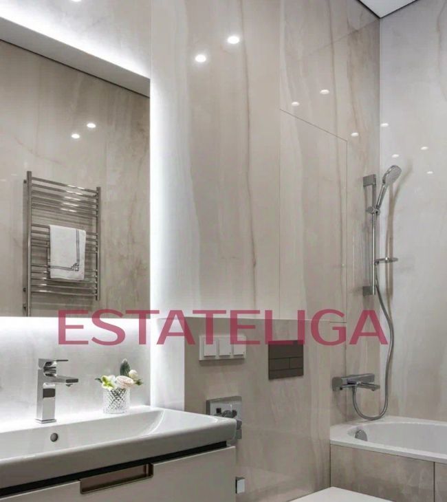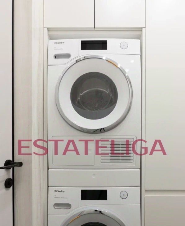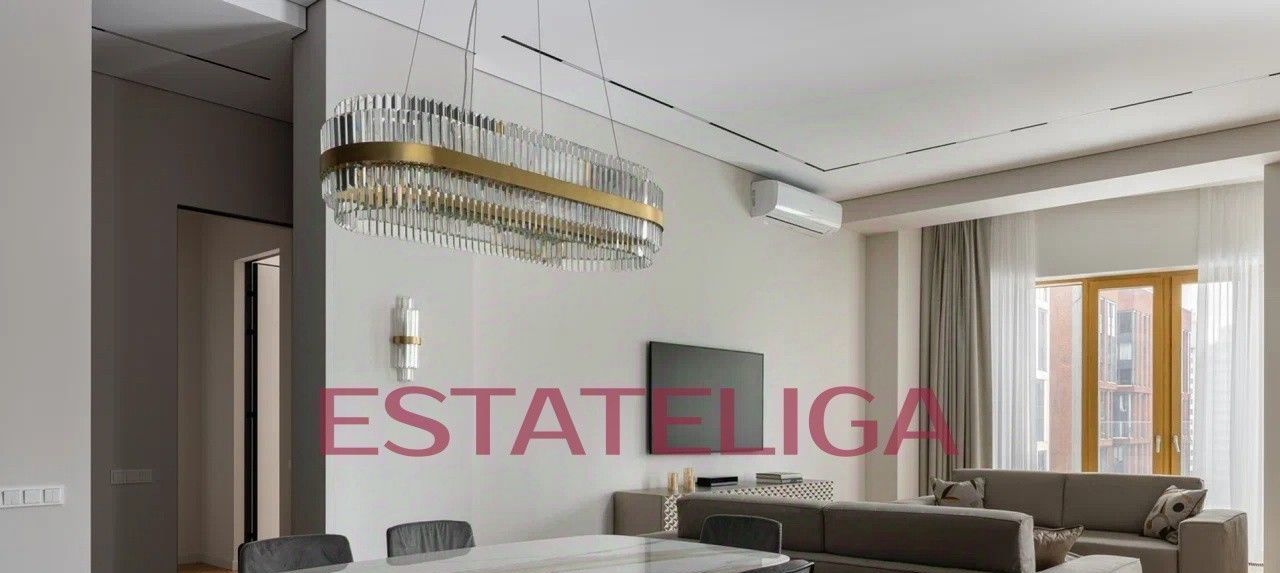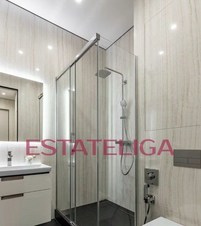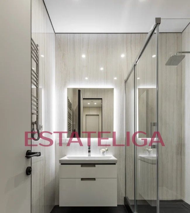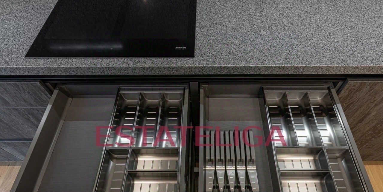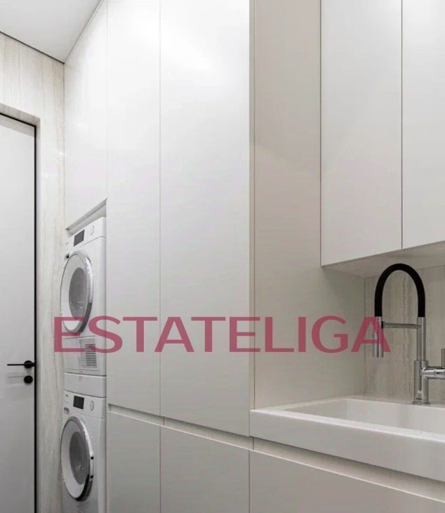 Планировкой квартиры предусмотрено: 2 мастер-спальни с собственными с/у и гардеробными, просторная кухня-гостиная с видом на пруд, 3 совмещенных с/у, включая постирочную комнату.