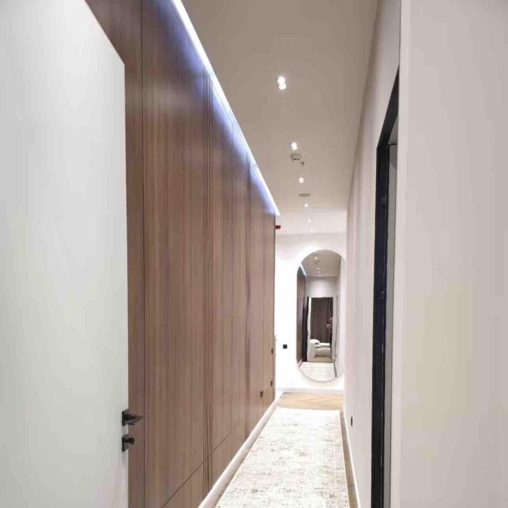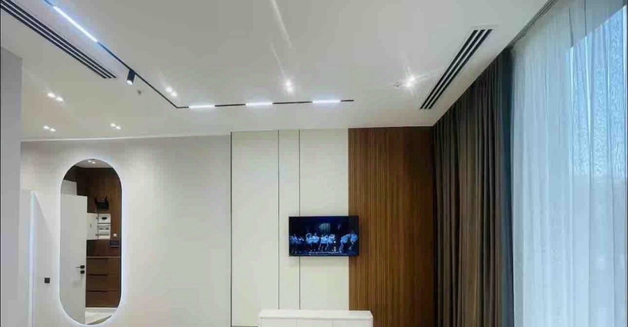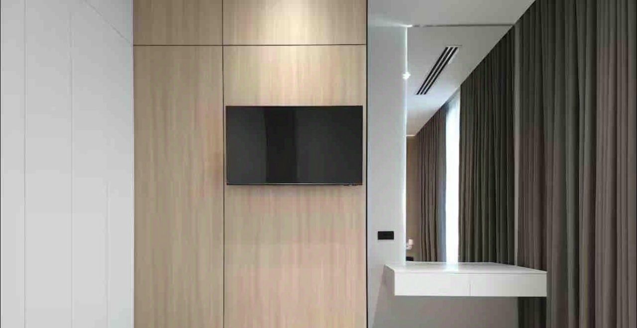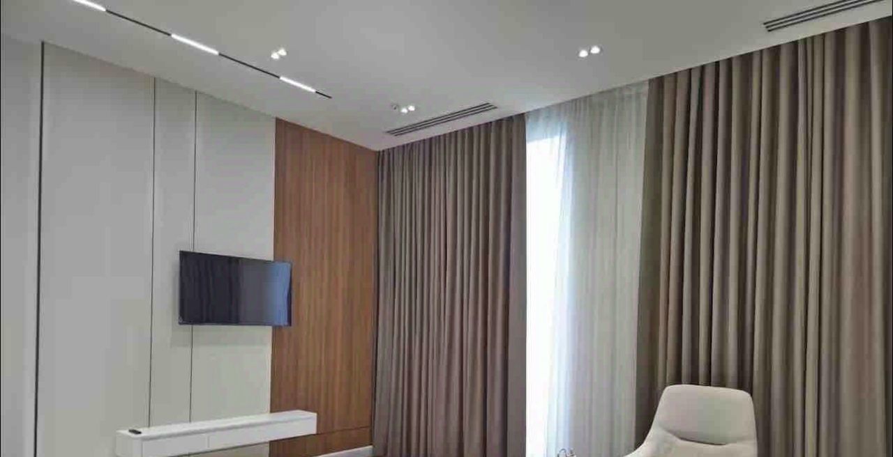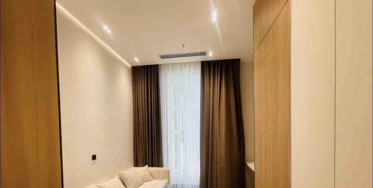 Дизайнерский ремонт выполнен в современном стиле. В интерьере использованы изысканные и продуманные решения. В квартире есть несколько гардеробных (в мастер-спальне - две, во второй спальне - собственная гардеробная, а также большая гардеробная в прихожей) и два санузла с душевыми кабинами. Также имеется просторная постирочная комната.