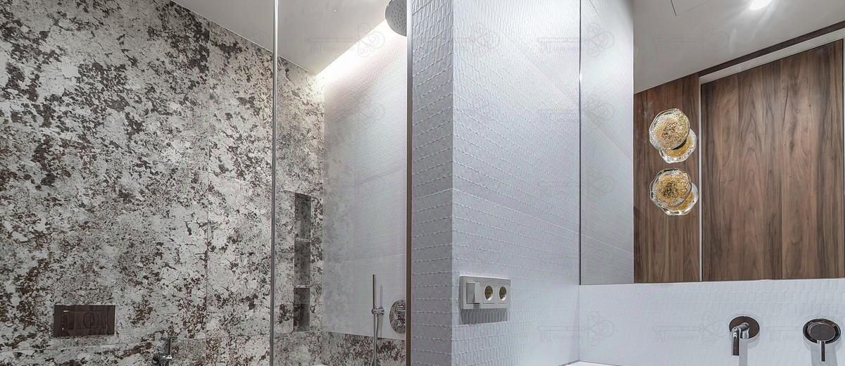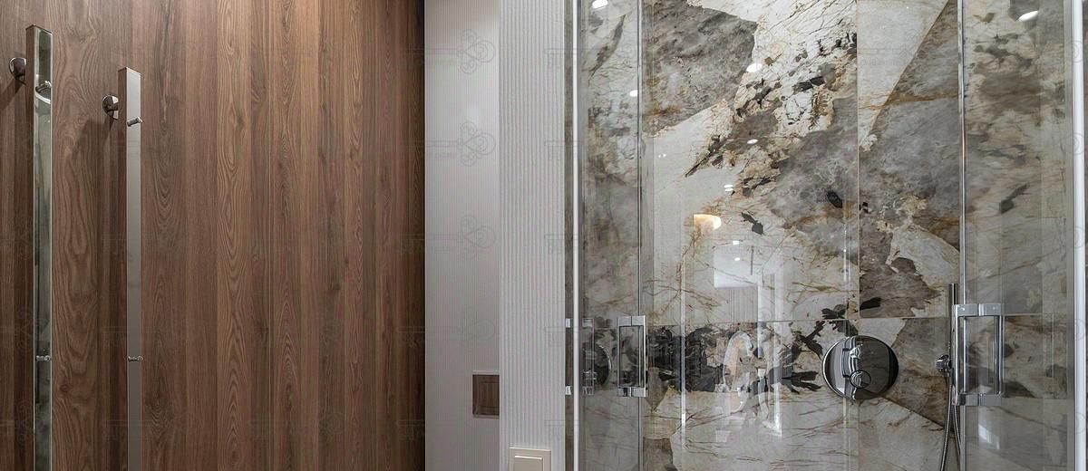 Использованы премиальные натуральные материалы (мрамор, ценные породы дерева, декоративная штукатурка);