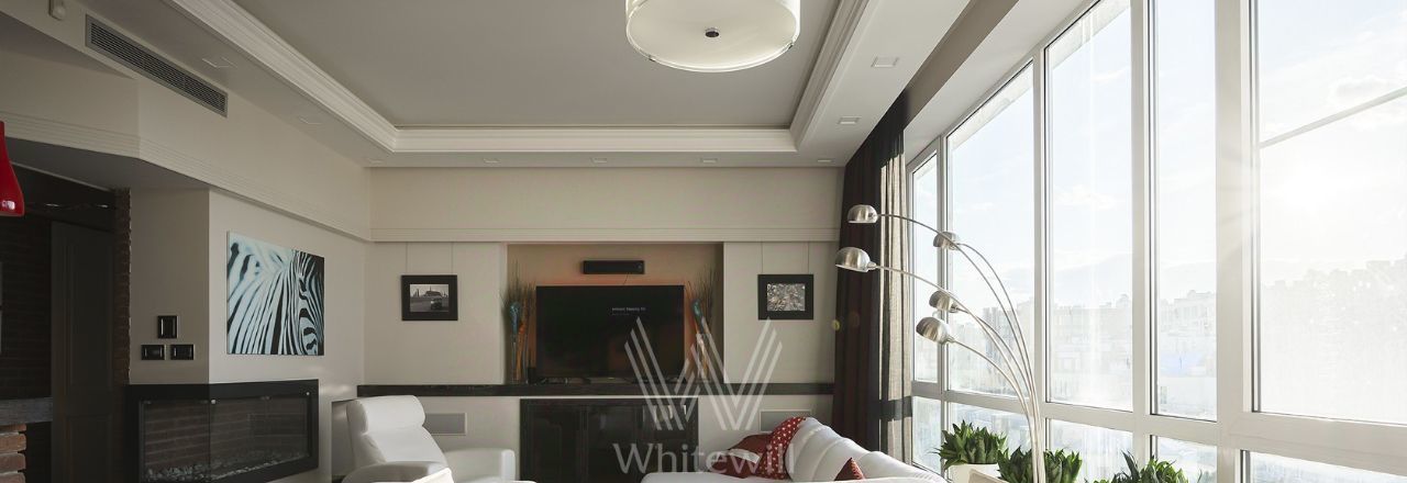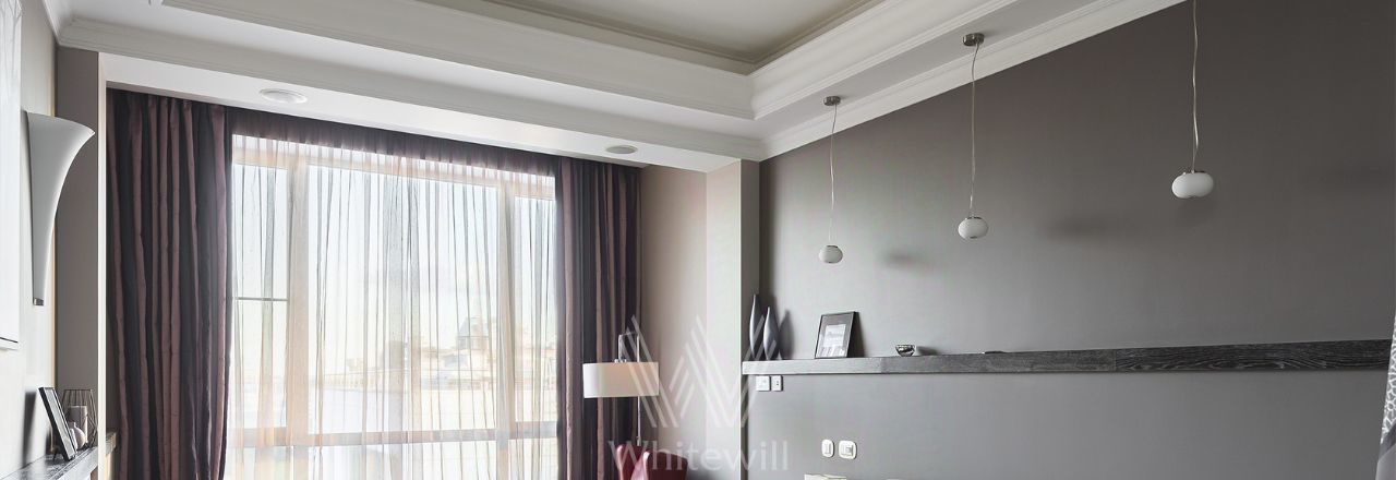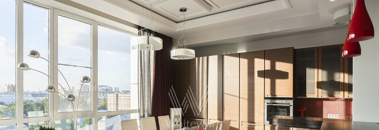 В квартире реализована система "Умный дом" - управление шторами с регуляцией света, консоль с линейной подсветкой, дежурная подсветка. Квартира полностью меблирована и укомплектована необходимой бытовой техникой - духовка Siemens, встроенный сабвуфер, зеркала от Philippe Starck, сантехника Villeroy & Boch, дизайнерские люстры. В санузлах уложена плитка и тёплые полы. Из окон открываются панорамы города. 2 машиноместа в подземном паркинге входит в стоимость аренды.