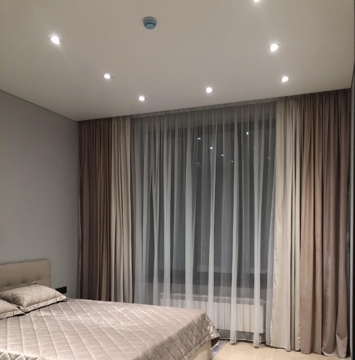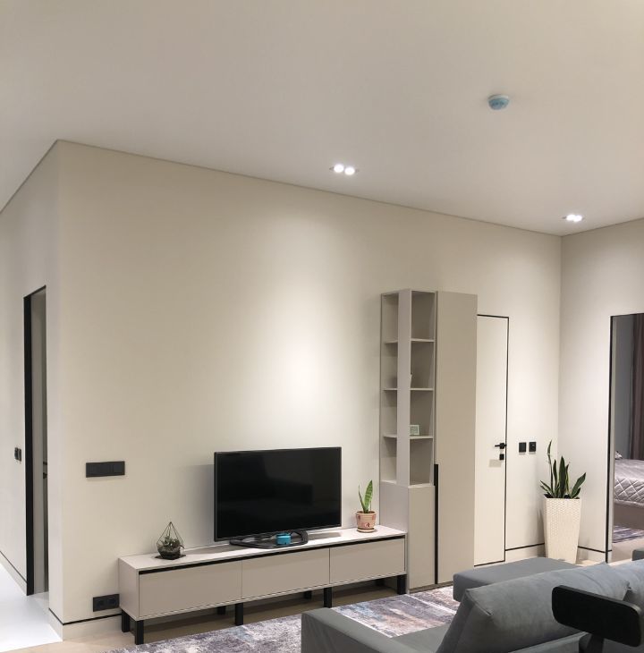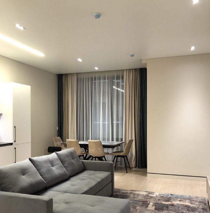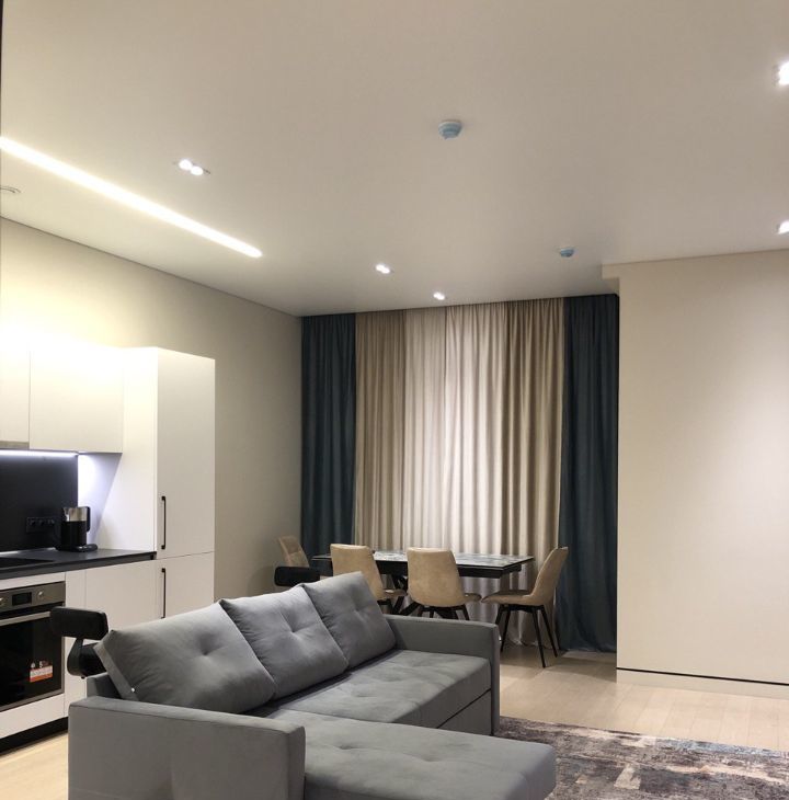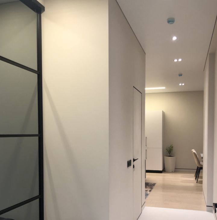 Отделка качественными, дорогими стройматериалами. Инженерная доска на полу, окрашенные стены, потолки с теневым профилем, плитка и пр.
