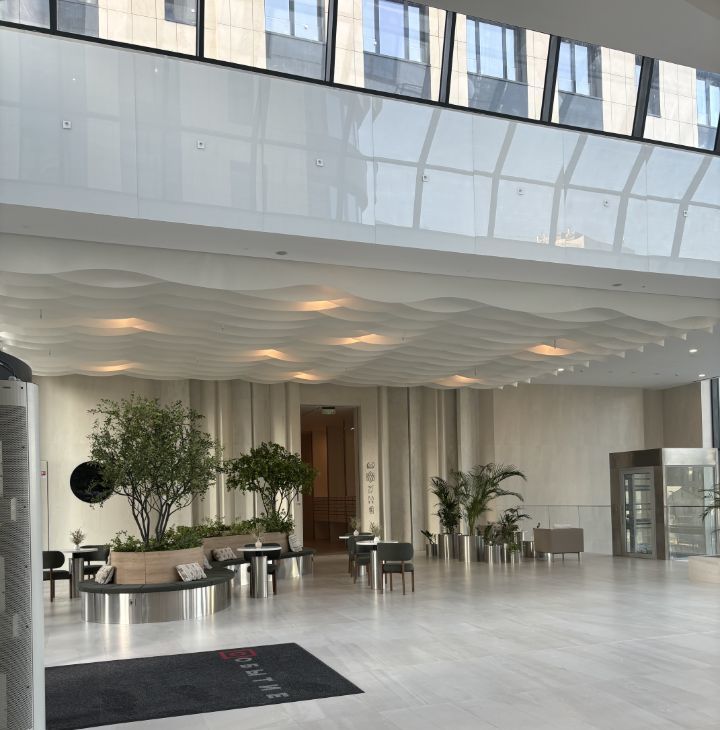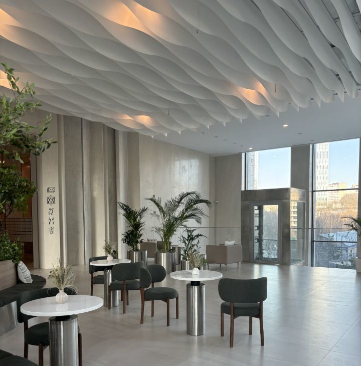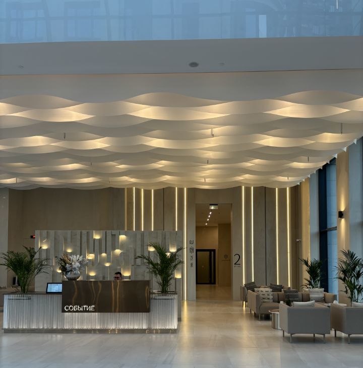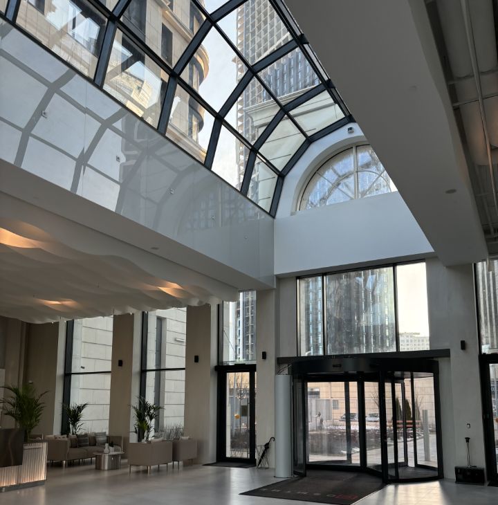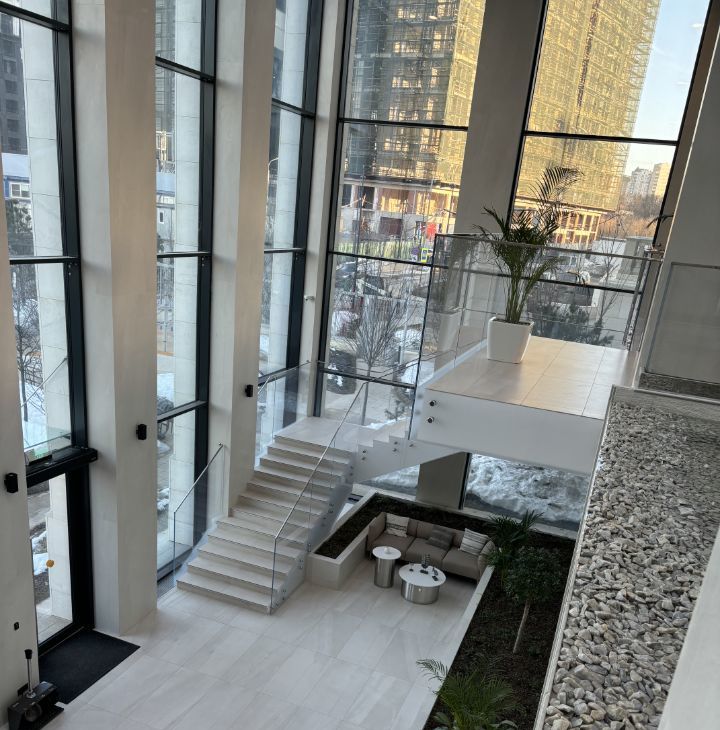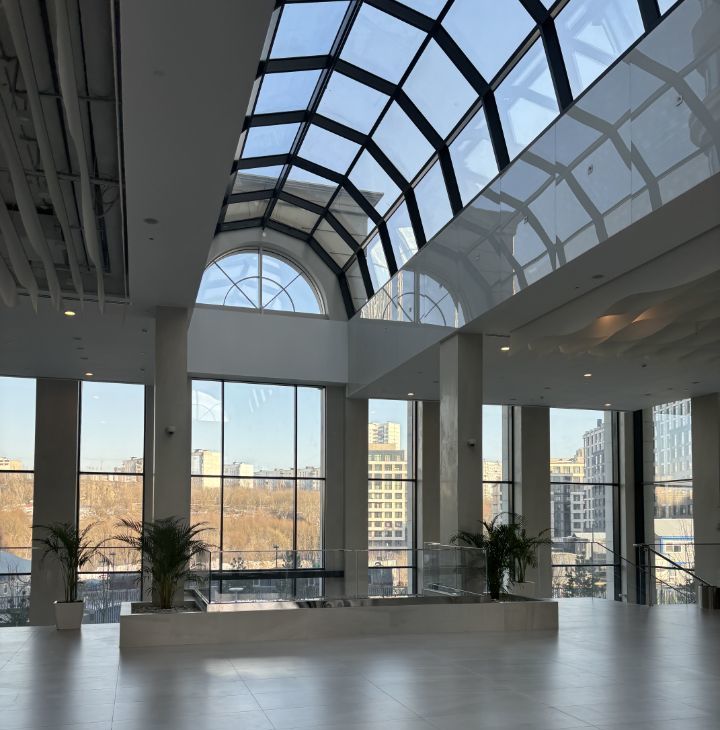 Дизайнерское лобби: двухуровневый атриум с витражными окнами