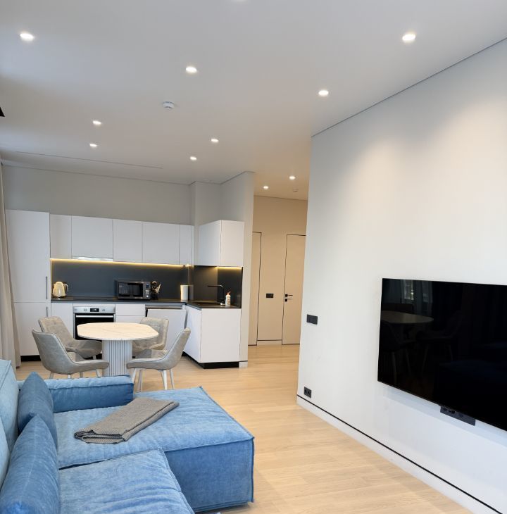 Ремонт от застройщика выполнен из самых дорогих материалов и легких в эксплуатации. Квартира уже оборудована техникой, необходимой для проживания. Далее будут монтированы гардеробные комнаты и зона прихожей. Одну комнату оставили без мебели под запрос арендатора.