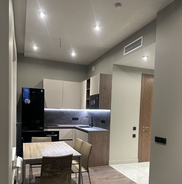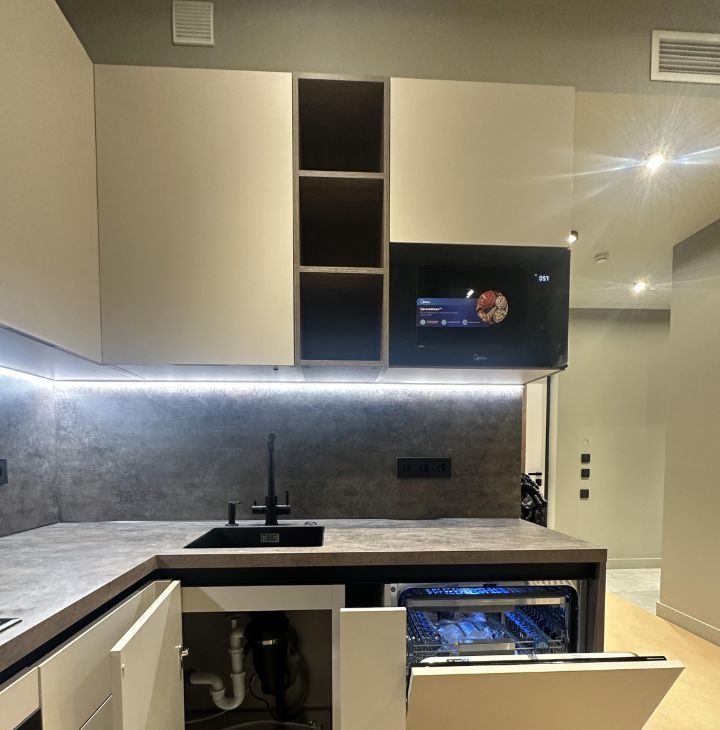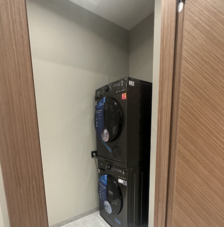 В квартире выполнен ремонт, установлен умный дом и интернет, кухня с посудомоечной машиной, стиральная и сушильная машины, спальня, мягкая мебель.