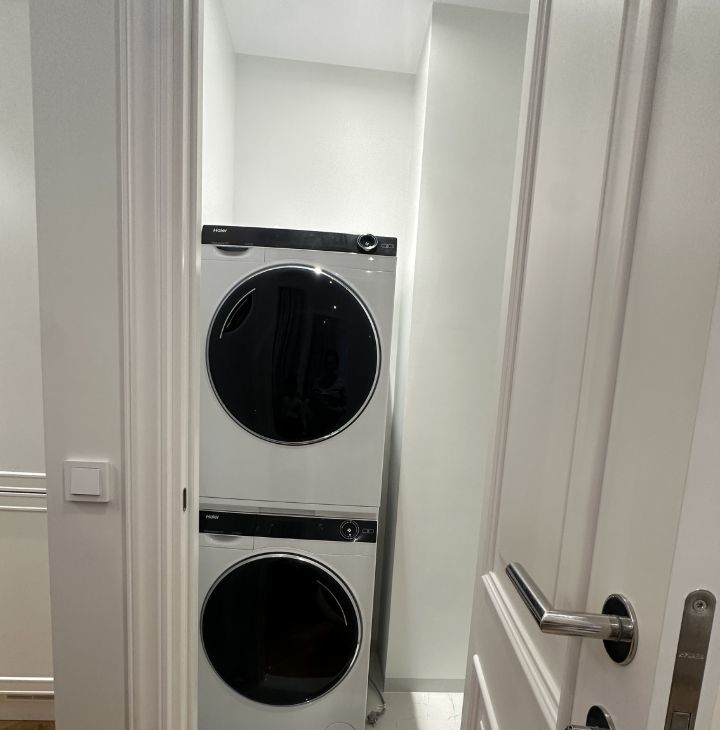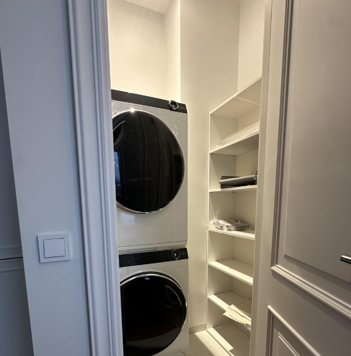 Постирочная укомплектована стиральной и сушильной машинами, полками для хранения.