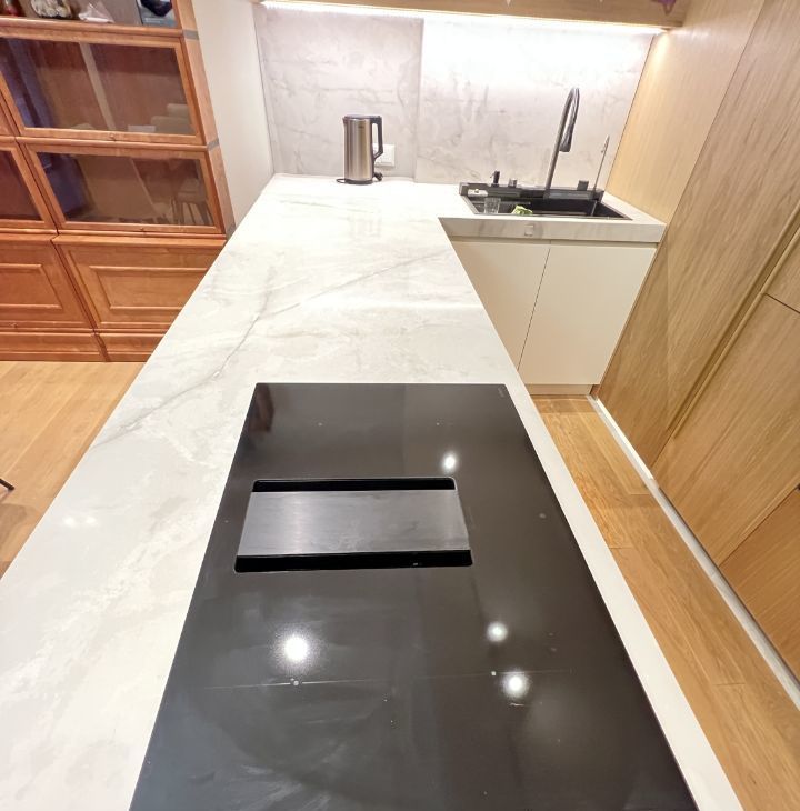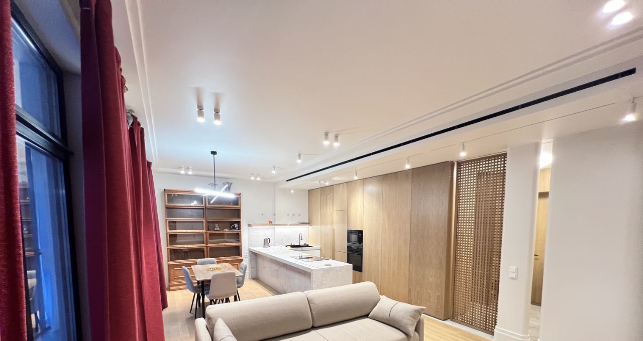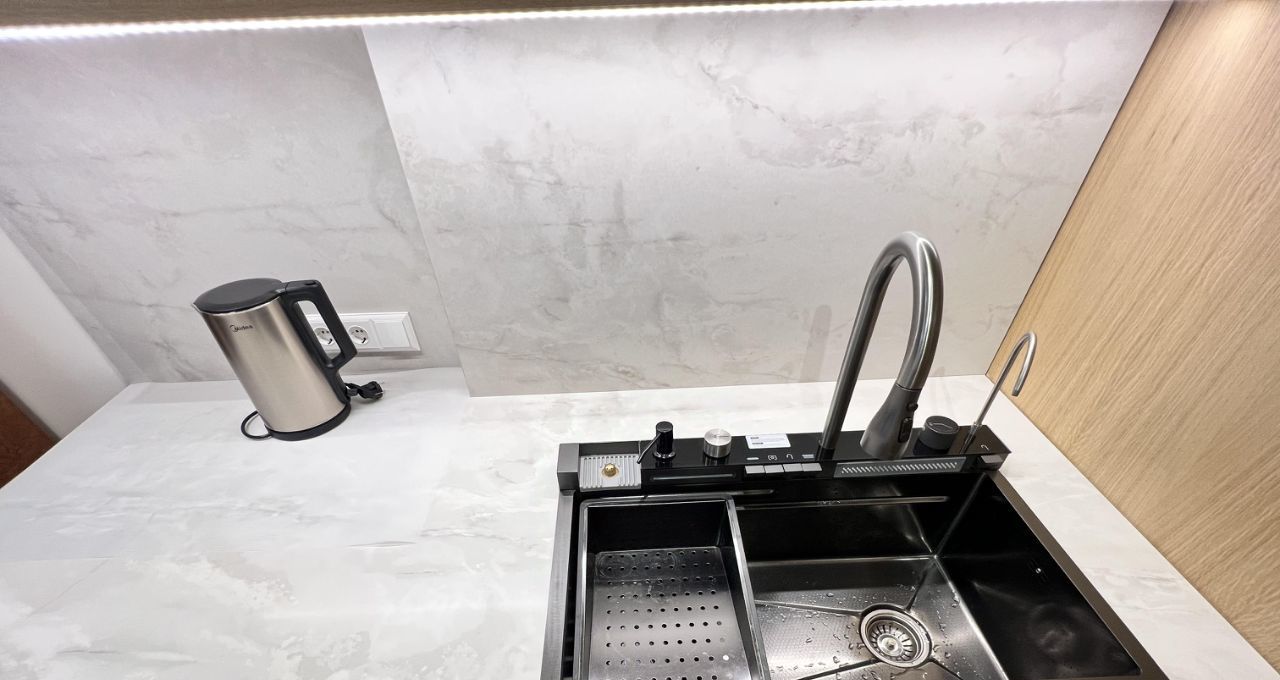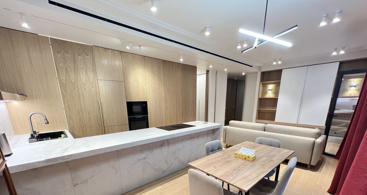 Квартира радует дизайнерским ремонтом и продуманной планировкой. Большая кухня гостиная площадью 40 кв. м обставлена современной мебелью и оснащена всей необходимой техникой премиального качества: холодильник asko, большая итальянская плита со встроенной вытяжкой, встроенный духовой шкаф и микроволновка Electrolux, посудомоечная машина. Кухня с кладовой комнатной, чтобы убирать всё лишнее с глаз, остававляя пространство без лишних деталей.