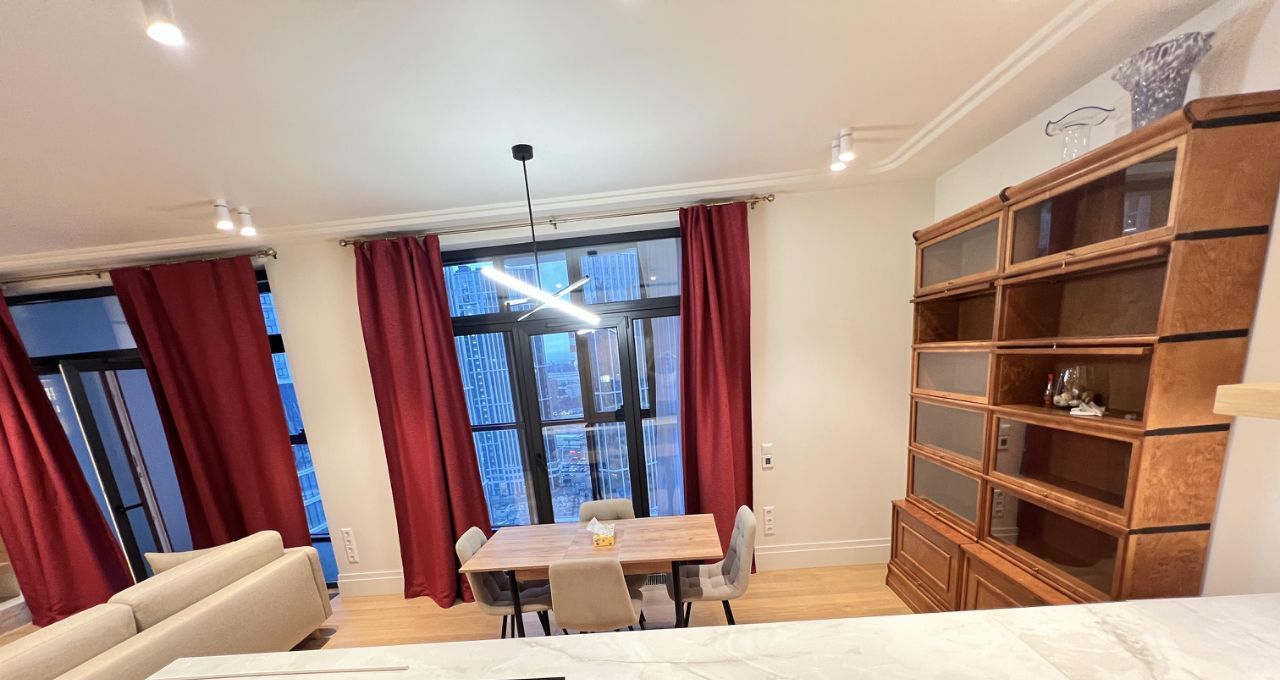 Предлагаем в аренду просторную трехкомнатную квартиру площадью 120 кв. м на 19 этаже современного 27-этажного дома в ЖК Событие. Новый современный квартал с развитой инфраструктурой. Высокие потолки 3.1 метра создают ощущение простора и света. Всего в нескольких минутах пешком находится метро, что делает это предложение особенно выгодным для тех, кто ценит удобство передвижения по городу.