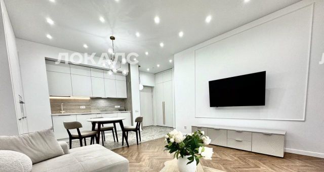 Кухня со столовой зоной оснащена встроенной техникой Weissgauff. В гостиной обустроена зона отдыха с угловым диваном и телевизором с диагональю 55 дюймов, 3 встроенных шкафа.