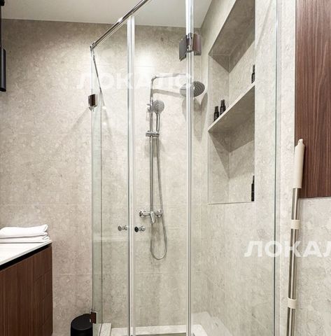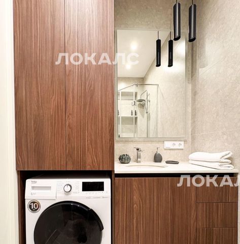 - санузел оснащен душевой кабиной с раздвижными дверцами, стирально-сушильной машиной, гардеробом для принадлежностей, зеркалом с подсветкой, гигиеническим душем;