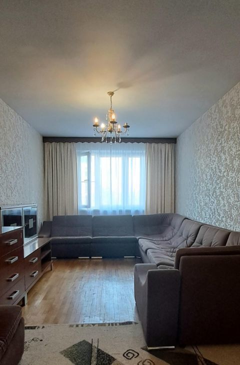 Кухня: кухонный гарнитур, большой двухкамерный холодильник, круглый обеденный стол со стульями. В комнатах: большой угловой диван и пуф, многофункциональный комод; двухспальная кровать; горка, диван. Стиральная машина. Интернет.