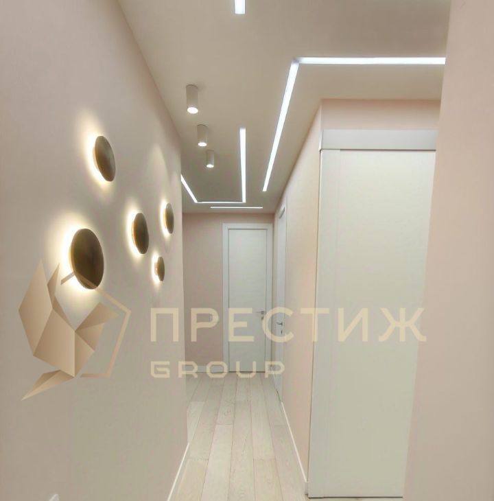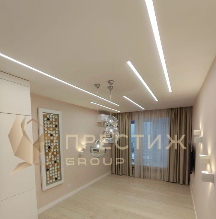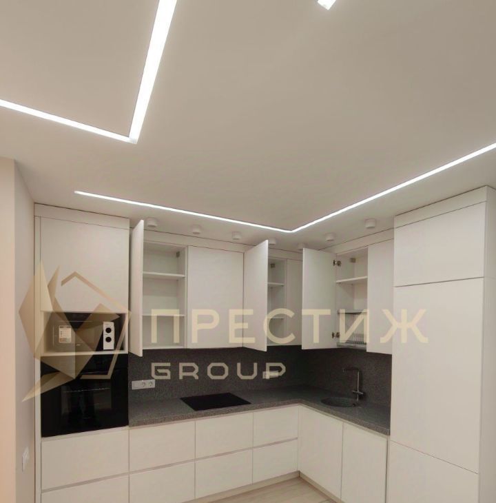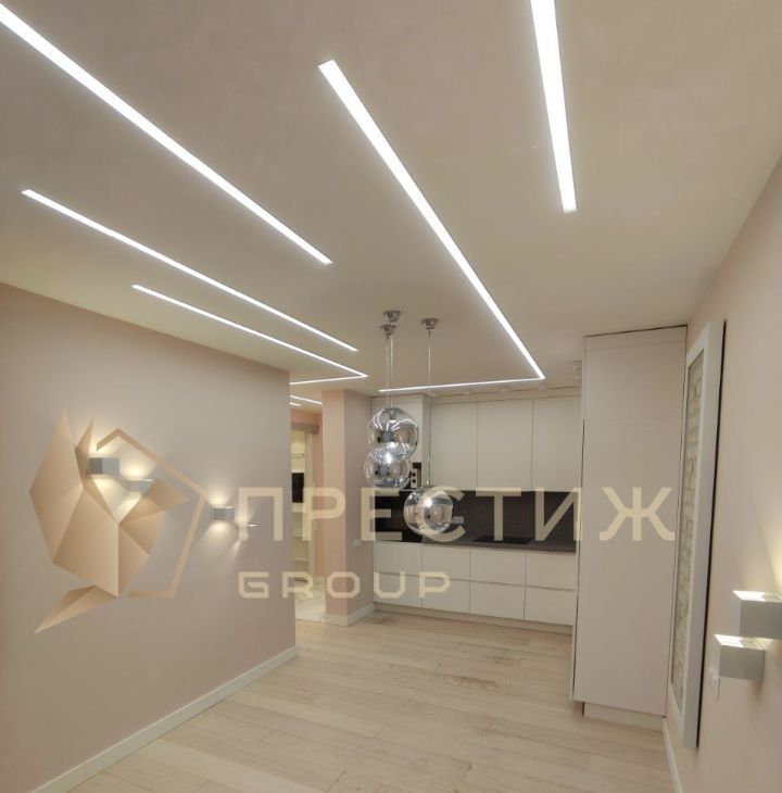 Большая просторная кухня-гостиная 20,8 м2, украшенная декоративной инсталляцией с видом во двор. Кухня 7.2 м2 с современным кухонным гарнитуром.