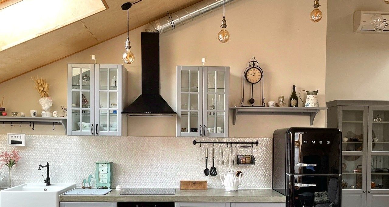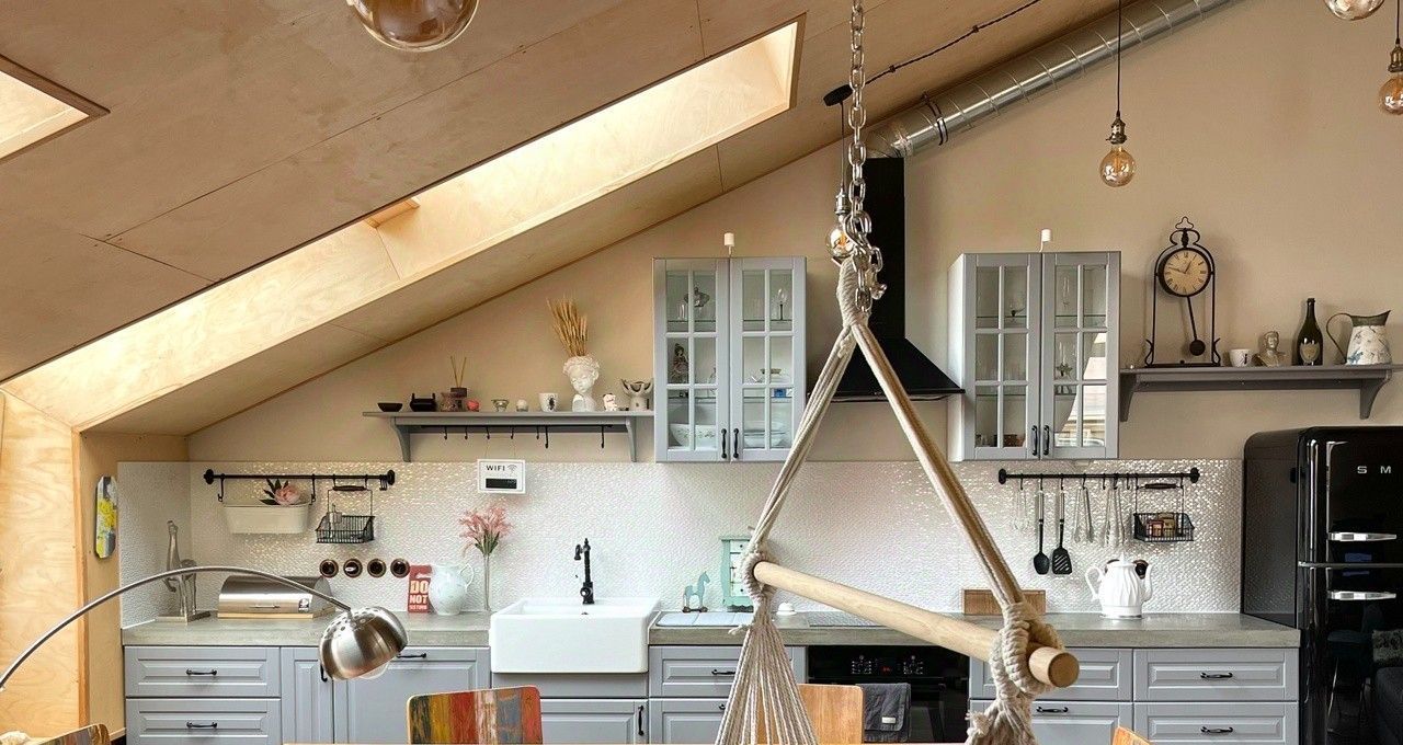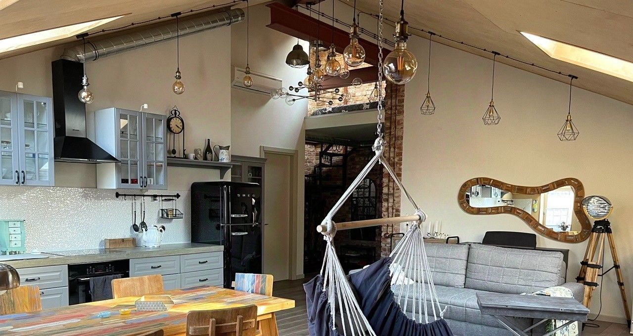 Планировка продумана для современного образа жизни. На первом уровне расположена гостиная и большая кухня, оборудованная техникой SMEG. Отдельная спальня и дополнительная уединенная спальная зона на втором уровне обеспечивают приватность. Вас ждут два современных санузла (с душевой кабиной и ванной), а также большая гардеробная. Отделка выполнена с безупречным вкусом: дубовый пол, качественные материалы и инженерные коммуникации, сантехника Villeroy & Boch, 18 итальянских окон Velux с видами на звёзды. Объект полностью укомплектован всей необходимой мебелью и техникой, включая кондиционер, посудомоечную машину, стиральную машину и высокоскоростной интернет. Окна выходят во двор, очень тихо, отличная шумоизоляция.
