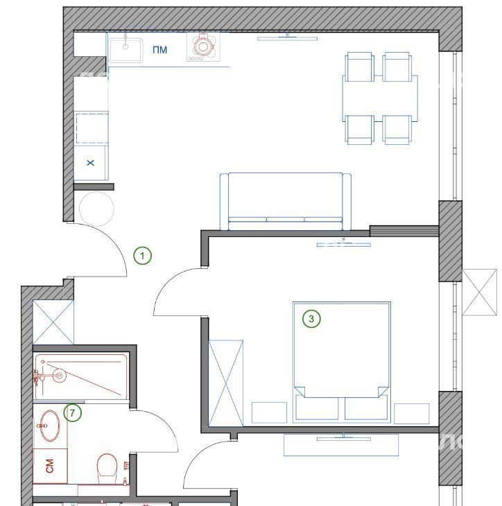 Планировка: кухня-гостиная с обеденной зоной, детская комната, спальня, гардеробная, два совмещенных санузла с ванной и душевой кабиной, прихожая.