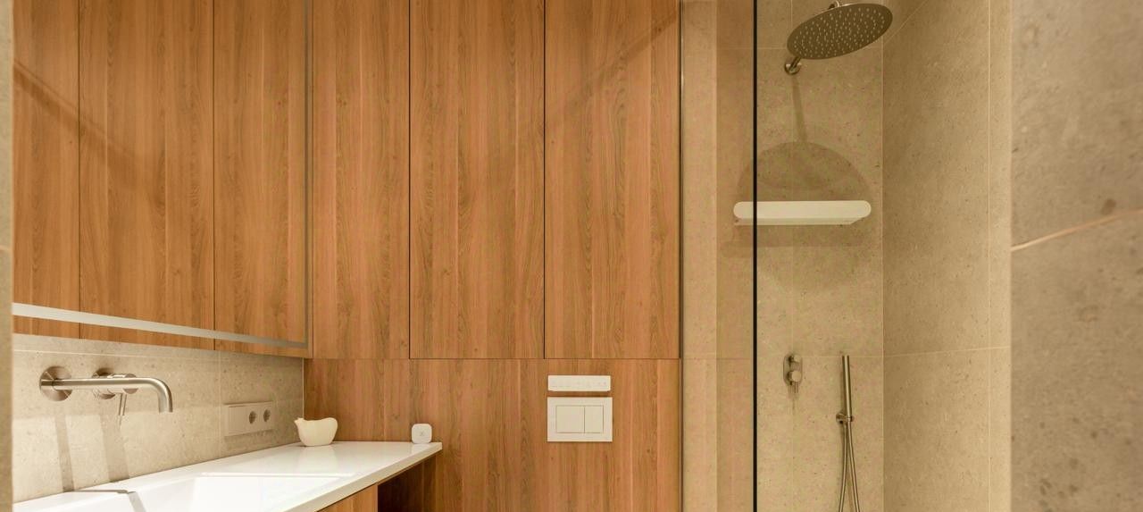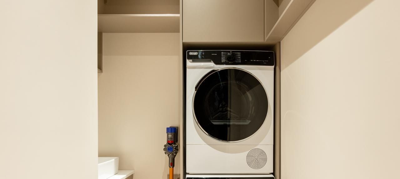 Планировка включает светлую кухню-гостиную, спальню и комнату свободного назначения (оборудуется по необходимости), гардеробную, постирочную комнату, 2 санузла. Пространство дополняют: