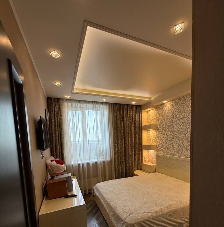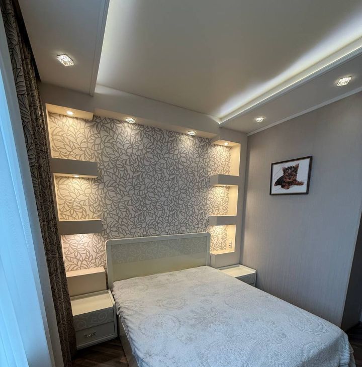 • Спальня с дизайнерской подсветкой и нишами, ортопедическим матрасом и комодом